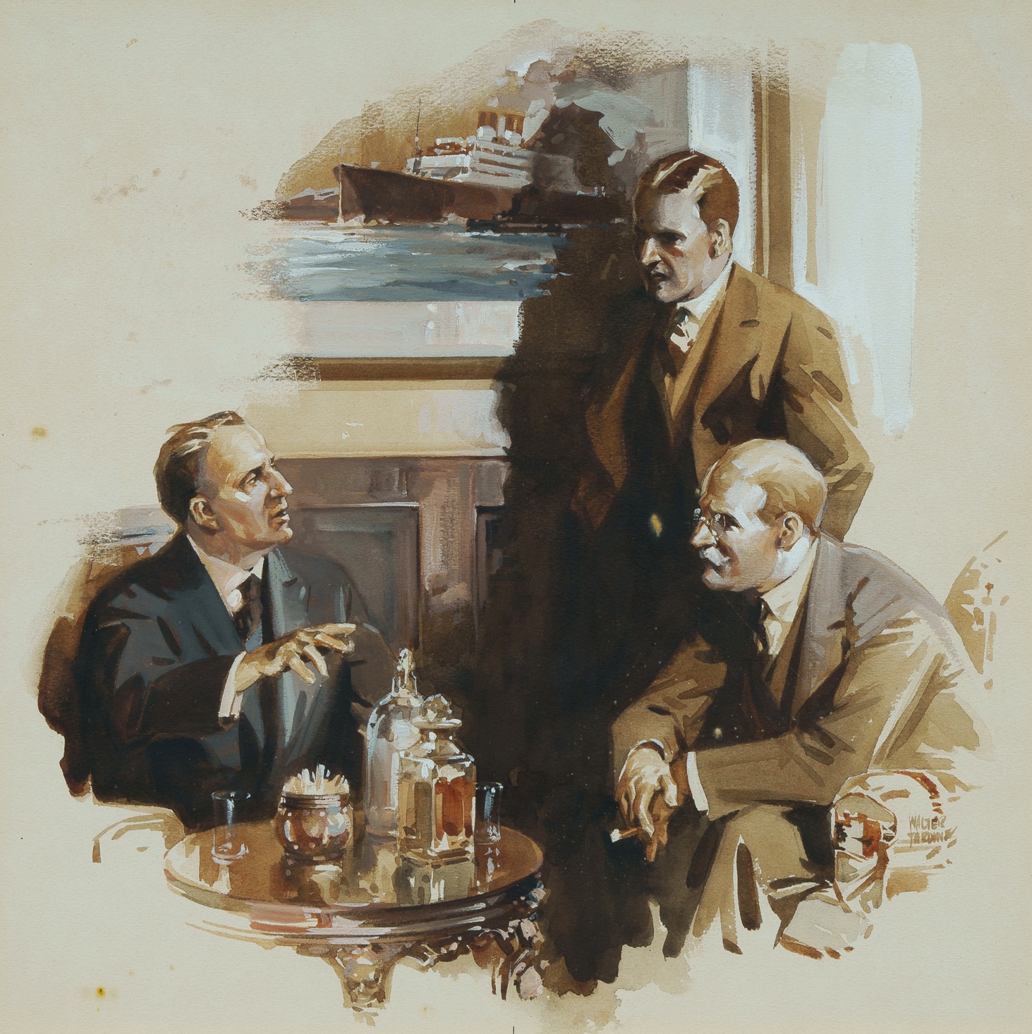 JARDINE, Walter (1884-1970) (2) 'Shipping Line Executives' (29.5x29.5cm); and 'Honeymoon Transportation' (29.5x19.5cm) Both signed lower right. Gouache (2) PROVENANCE: The Fred and Elinor Wrobel Collection, Sydney; Estate Late Elinor Wrobel.Estimate $150-300