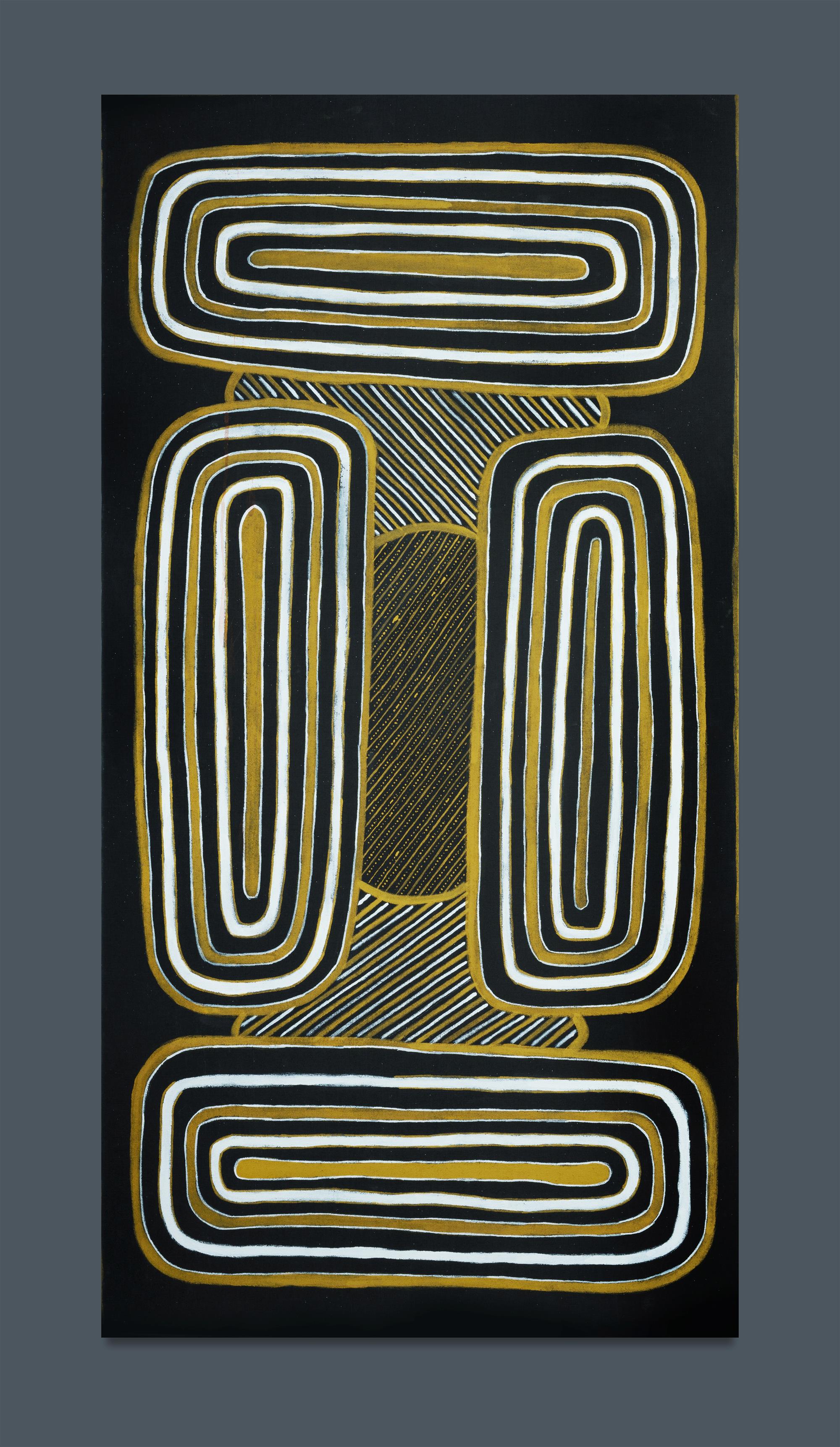 ORSTO, Reggie (Aboriginal School) Untitled, 2011. Acrylic on Linen 150x80cm PROVENANCE: Munupi Arts and Crafts Association, Tiwi Islands, cat #MU11RPO581; private collection, Sydney.Estimate $300-500