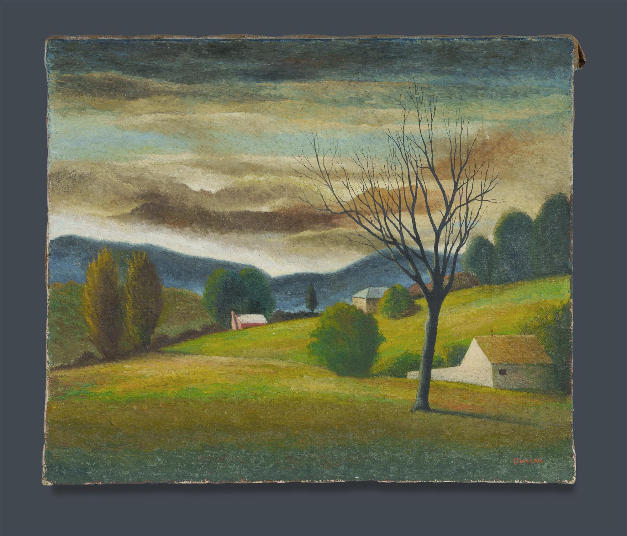 DUNCAN, George (1904-1974) 'Berrima Pastures' Signed lower right. Oil on Hessian 51x61cm PROVENANCE: Family of the ArtistEstimate $500-800