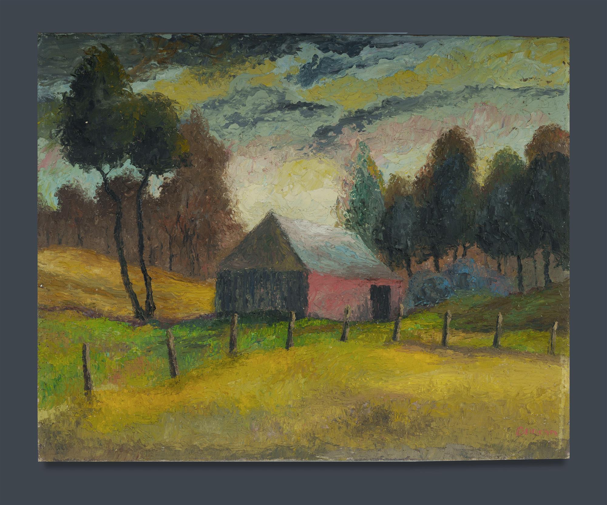 DUNCAN, George (1904-1974) Barn and Trees Signed lower right. Oil on Board 40.5x50.5cm PROVENANCE: Family of the ArtistEstimate $300-500