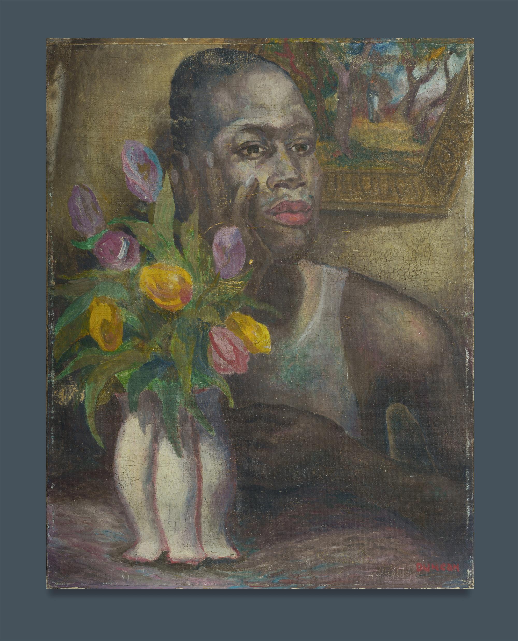 DUNCAN, George (1904-1974) Portrait of Man with Flowers Signed lower right. Oil on Canvas on Board 51x39cm PROVENANCE: Family of the ArtistEstimate $250-450