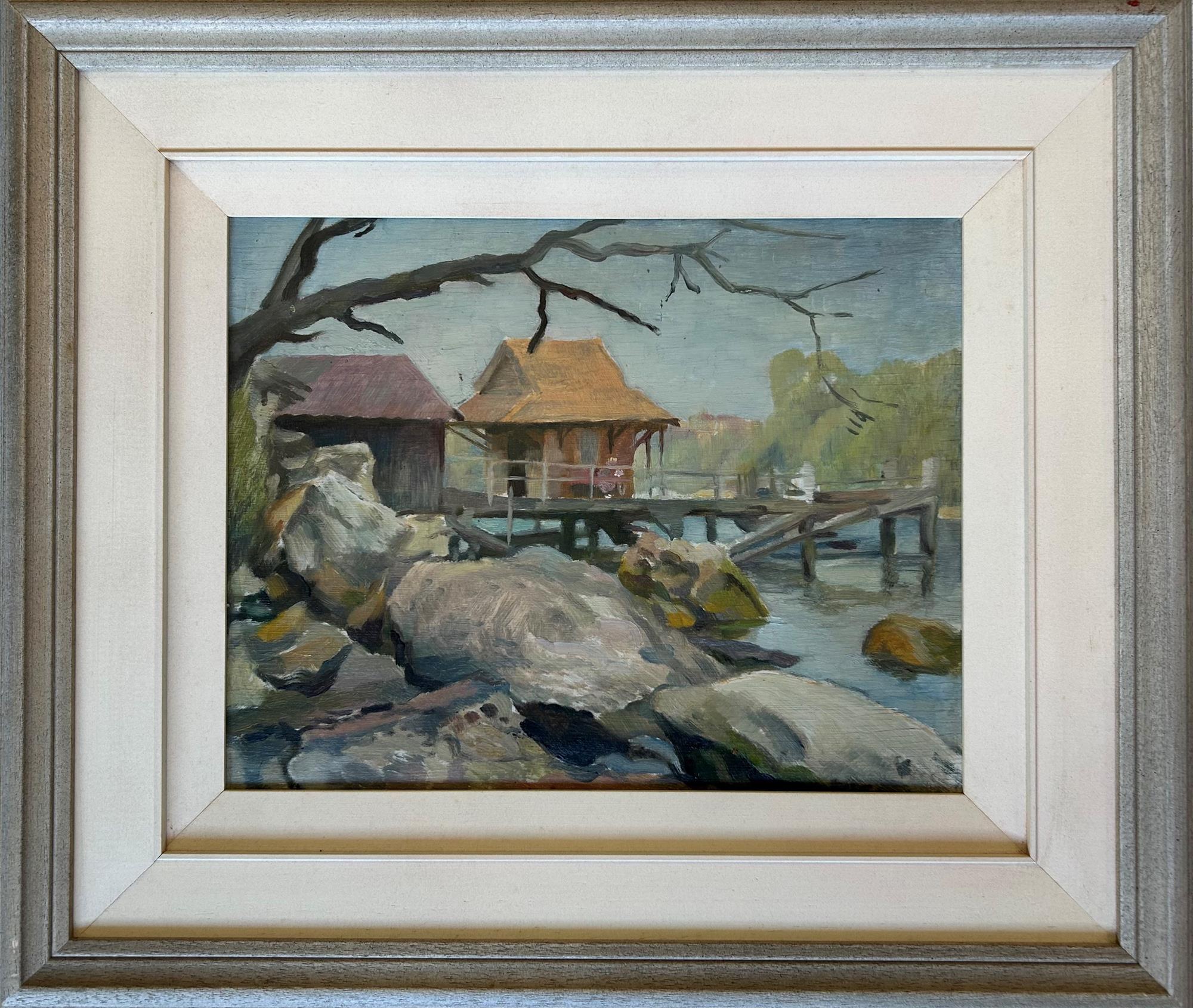 SMITH, Joshua (1905-1995) 'Boat-houses II,' c.1940. Unsigned, but with certificate of authenticity, signed by Yve Close, verso. Oil on Ply 27x35cm PROVENANCE: Estate Late Joshua Smith; Estate Late Yvonne O'Hara-Close (artist Yve Close) EXHIBITIONS: Joshua Smith - Artist - A Retrospective, Manly Art Gallery and Museum, 2nd December 2005 - 22nd January 2006 (#52)Estimate $250-450