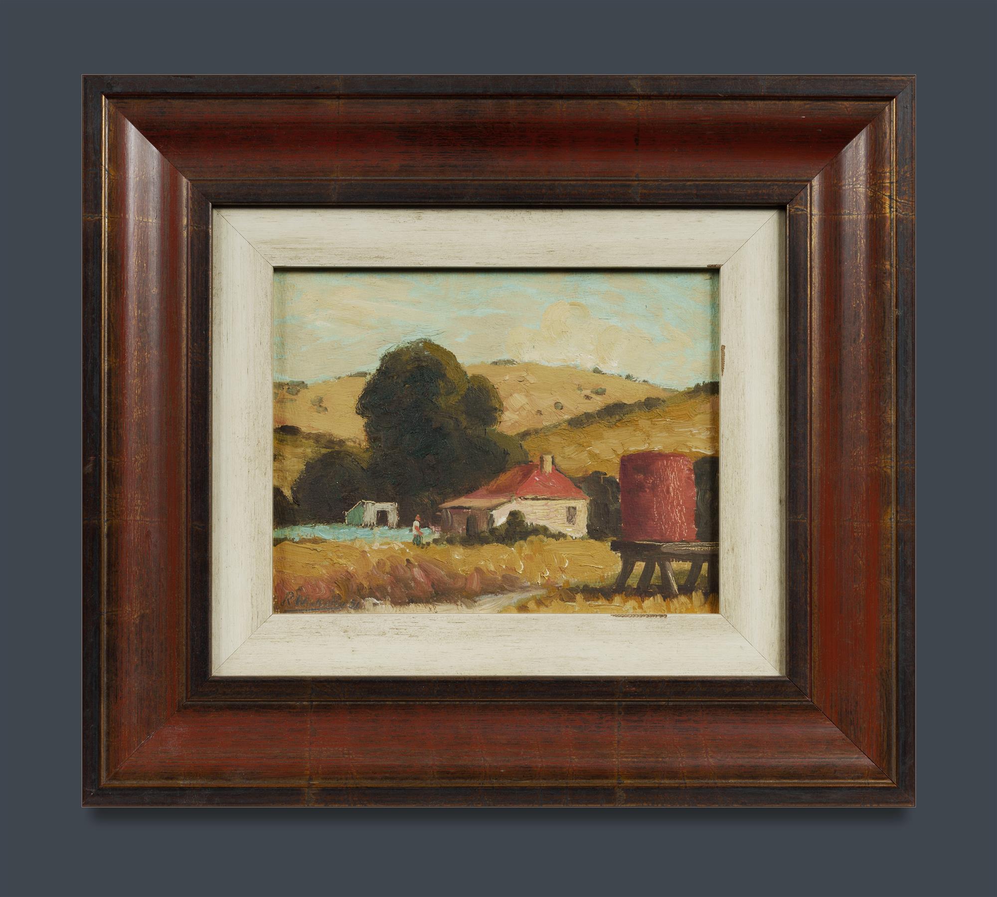 WAKELIN, Roland (1887-1971) Farm Scene, 1951. Signed lower left. Oil on Board 17x21.5cm PROVENANCE: Estate of June Caroline Sherry, Lawsons, Sydney, 29th April 2021 (lot 511)Estimate $1,000-1,800