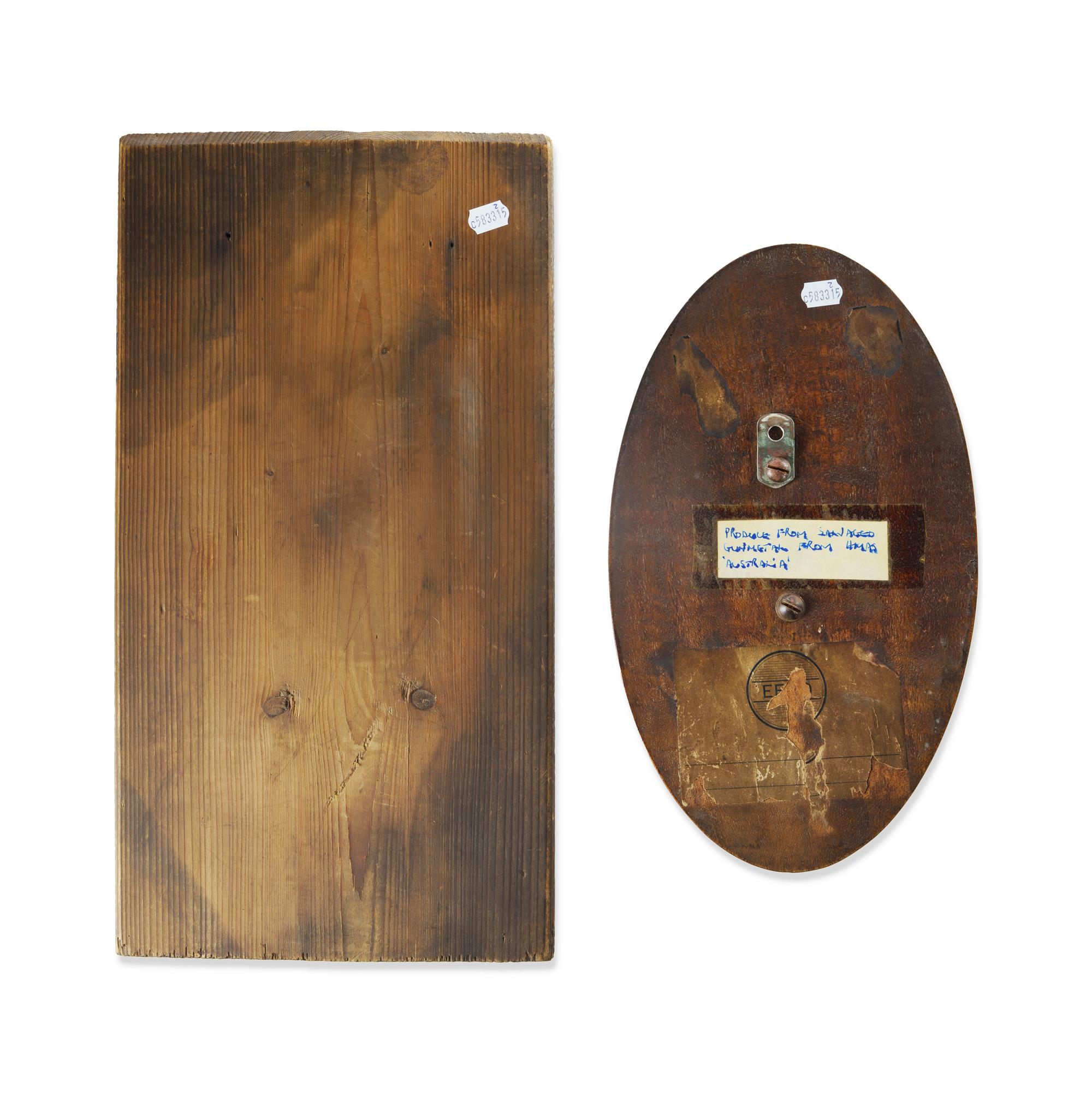 Cast Bronze Kookaburra with Snake Mounted on an oval wooden plaque, note veros reads 'produced from salvaged gun metal from HMAS Australia' (H27cm). Together with a pyrographed panel decorated with a WWI digger.Estimate $100-200