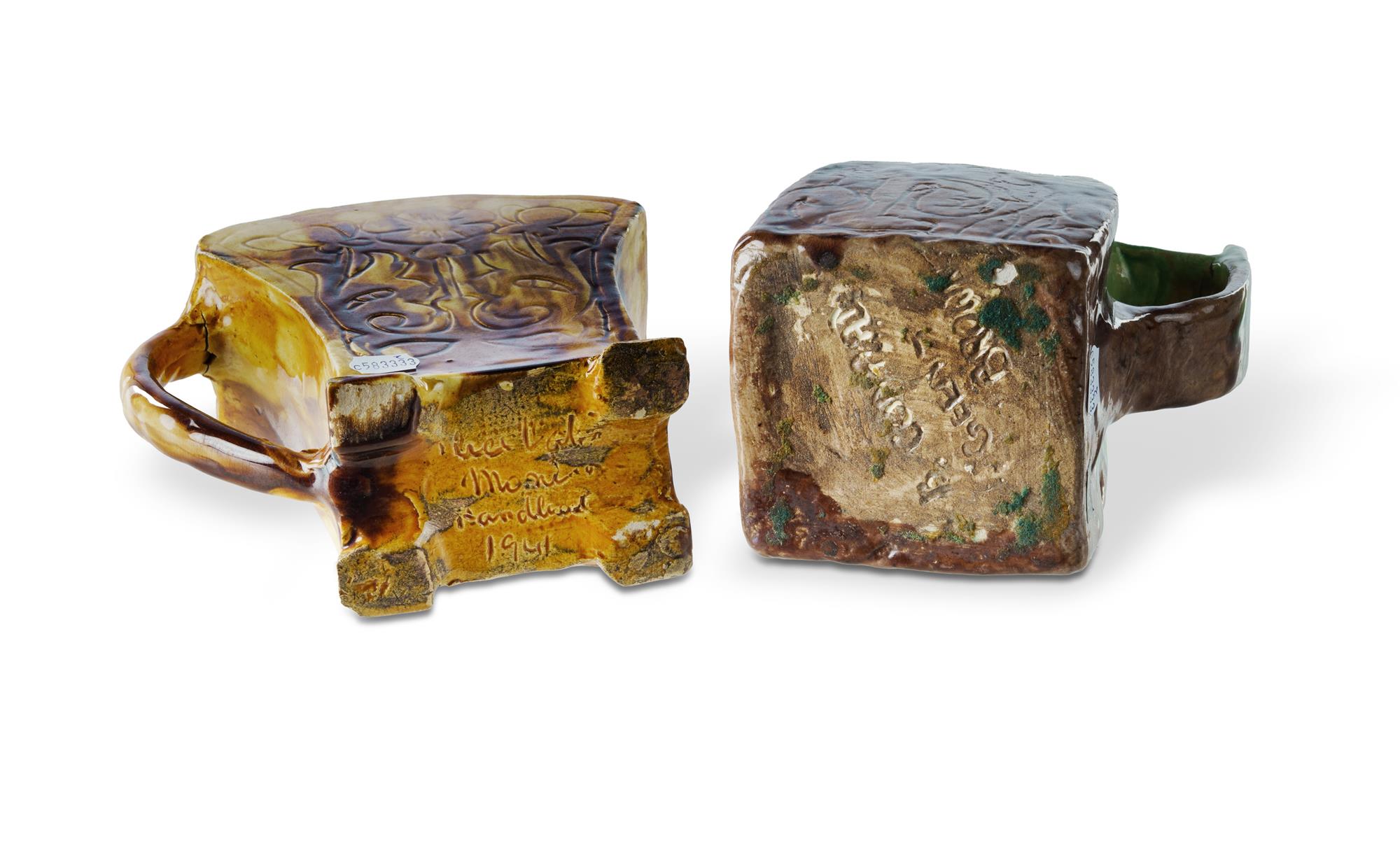 2 Hand Built Australian Pottery Jugs Each with sgraffito decoration. Incised signatures to base illeg. (H17cm)Estimate $100-200