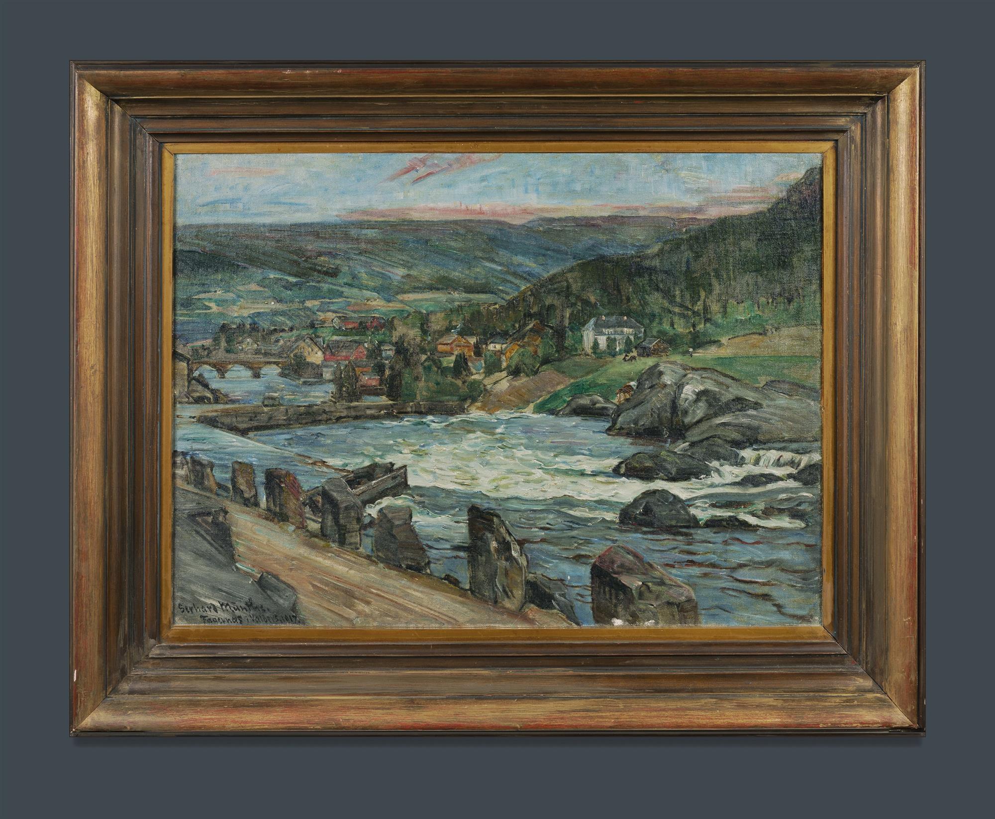 MUNTHE, Gerhard (Norwegian 1849-1929) 'Fagernes in Valdres [Norway]' 1917. Signed lower left. Handwritten text panel verso dated 28th August 1936 (Oslo) Oil on Canvas on Board 49x67cmEstimate $2,000-3,000