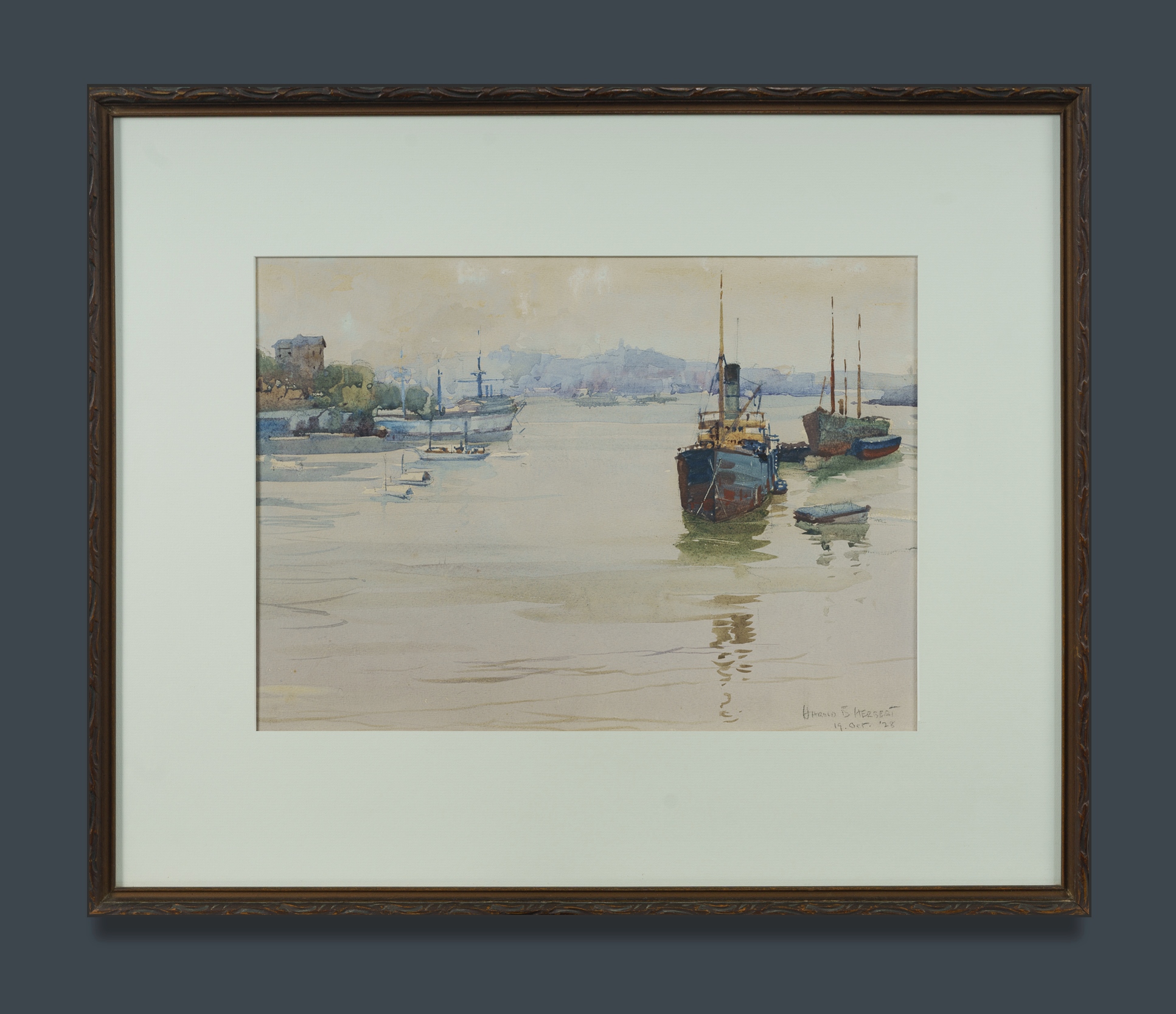 HERBERT, Harold B (1891-1945) Sydney Harbour, 1928. Signed and inscribed with date 19th Oct, 1928 (interestingly, on this same date he was married in Surry Hills) W/Clr 32x45.5cmEstimate $600-1,000