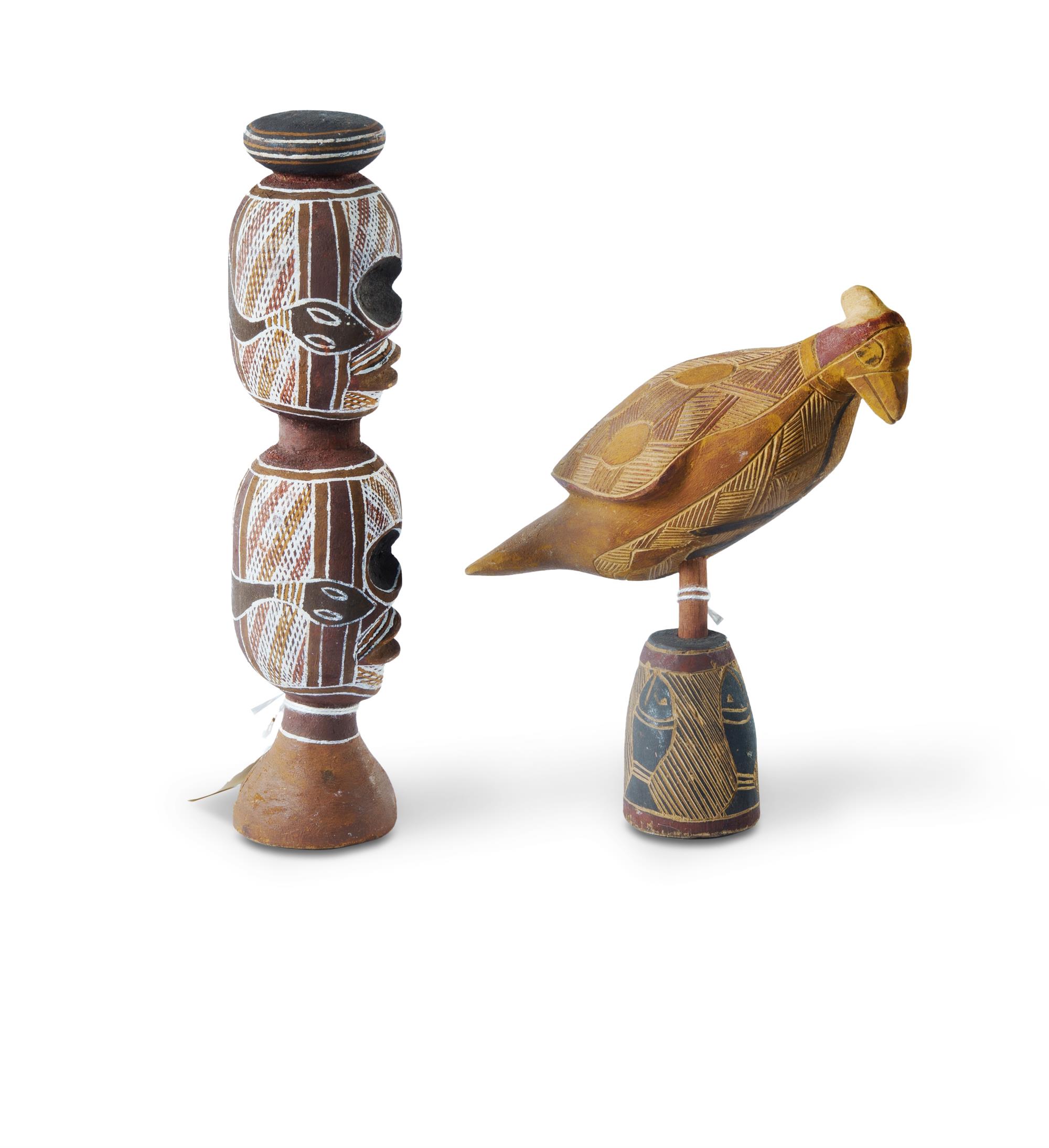 MUNUNGGURR, Mutjijpui (Aboriginal c.1932-1993) 'Double Skull,' 1958, and 'White Crested Dove,' c.1958. Ex Sotheby's. Milkwood Carving with Natural Earth Pigments (2) H22.5cm (skull) H19cm (dove) PROVENANCE: Collection Mr H & Mrs P Wallace, Sydney.Estimate $600-1,000