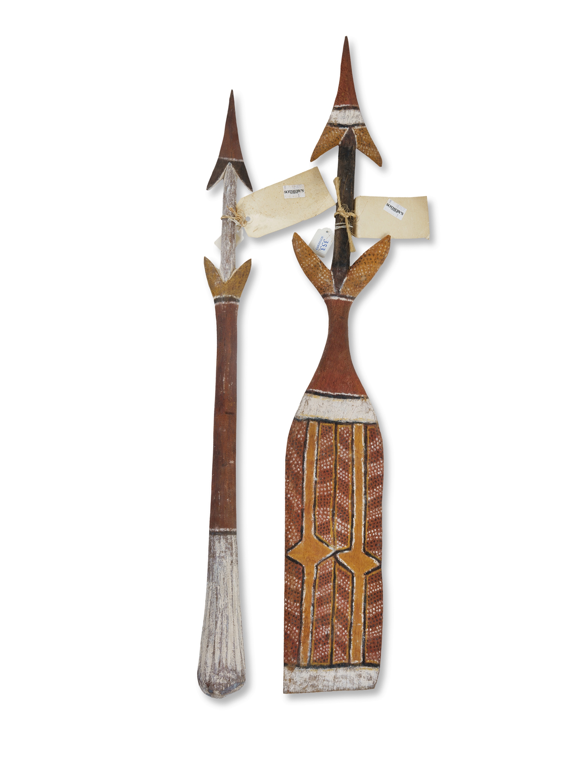 WOMMATAKIMMI Mani-Luki (Harry Carpenter) (Aboriginal c.1918-1980), 2 Tiwi Ceremonial Weapons, circa 1958, Each with labels bearing Bennett Collection No. 640A and No. 61C. Ex Sotheby's Australia, 9/7/2001 (lot 353) Natural Earth Pigments on Hardwood (L83cm, & 92cm) PROVENANCE: Collection Mr H & Mrs P Wallace, Sydney.Estimate $1,000-2,000