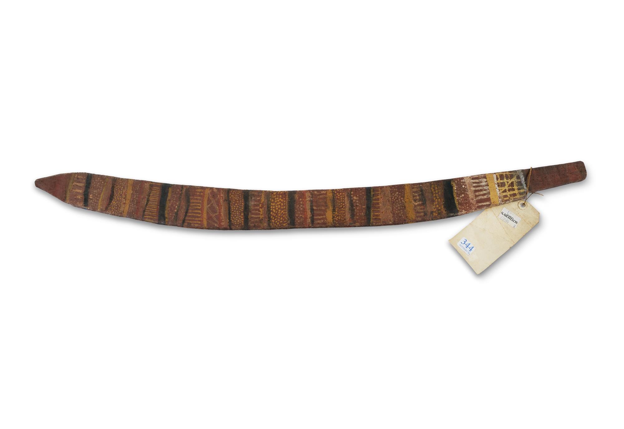 Tiwi Decorated Boomerang, circa 1958. Bennett Collection label with cat #633. Hardwood with Natural Earth Pigments (L83cm) PROVENANCE: Collection Mr H & Mrs P Wallace, Sydney.Estimate $200-400