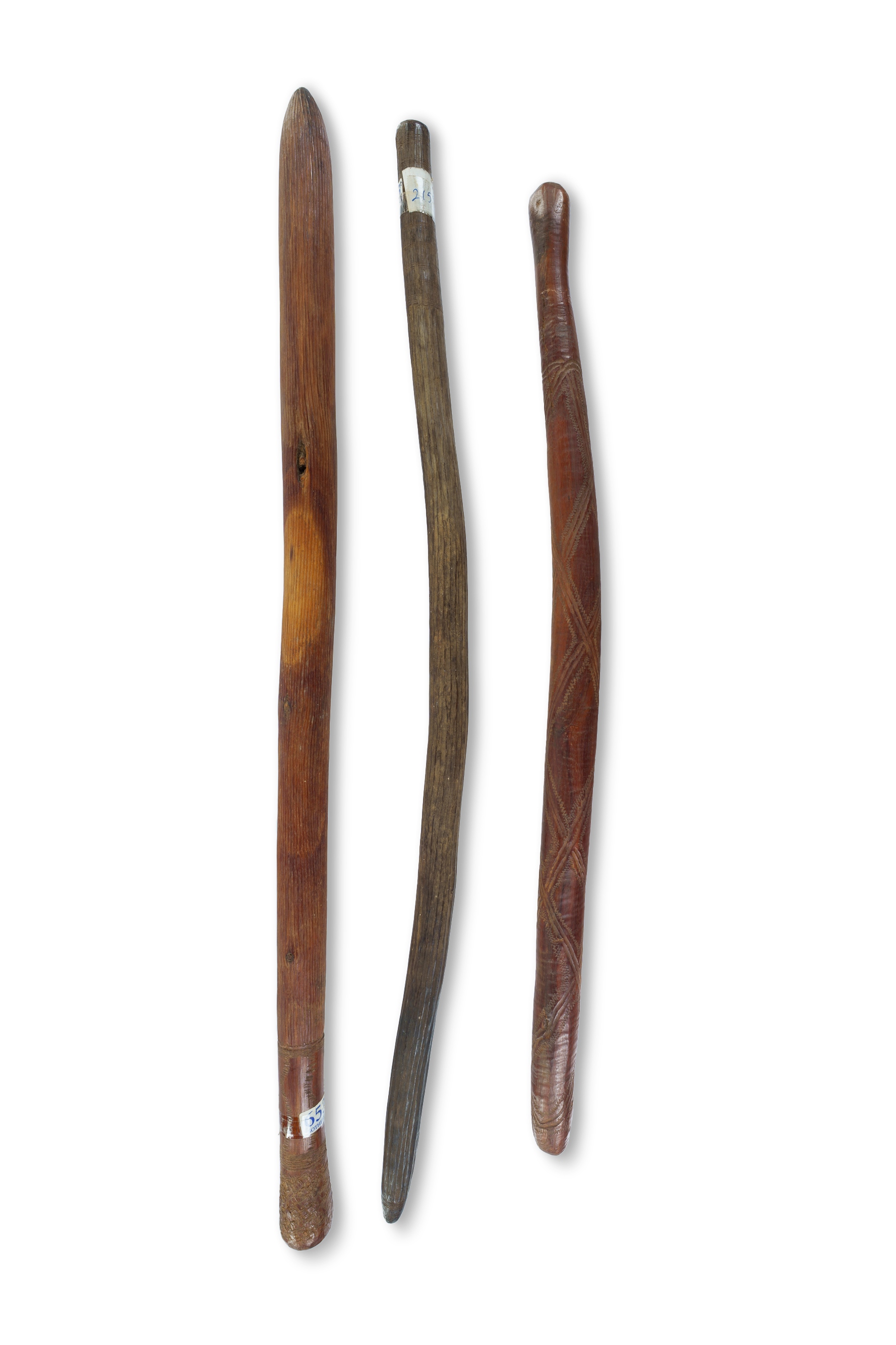 Three Western Australian Null Nulla Fighting Clubs Each with incised decoration. Two Ex Sotheby's Australia, 9/11/1997 (lot 653) L74cm (each) PROVENANCE: Collection Mr H & Mrs P Wallace, Sydney.Estimate $500-800