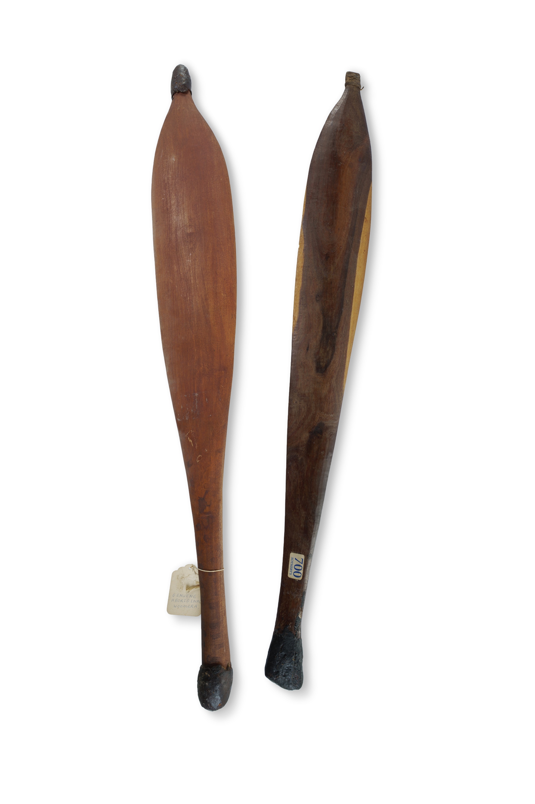 Two Australian Woomeras Mulga wood with incised geometric decoration. (L74cm, & 75cm) PROVENANCE: Collection Mr H & Mrs P Wallace, Sydney.Estimate $300-500