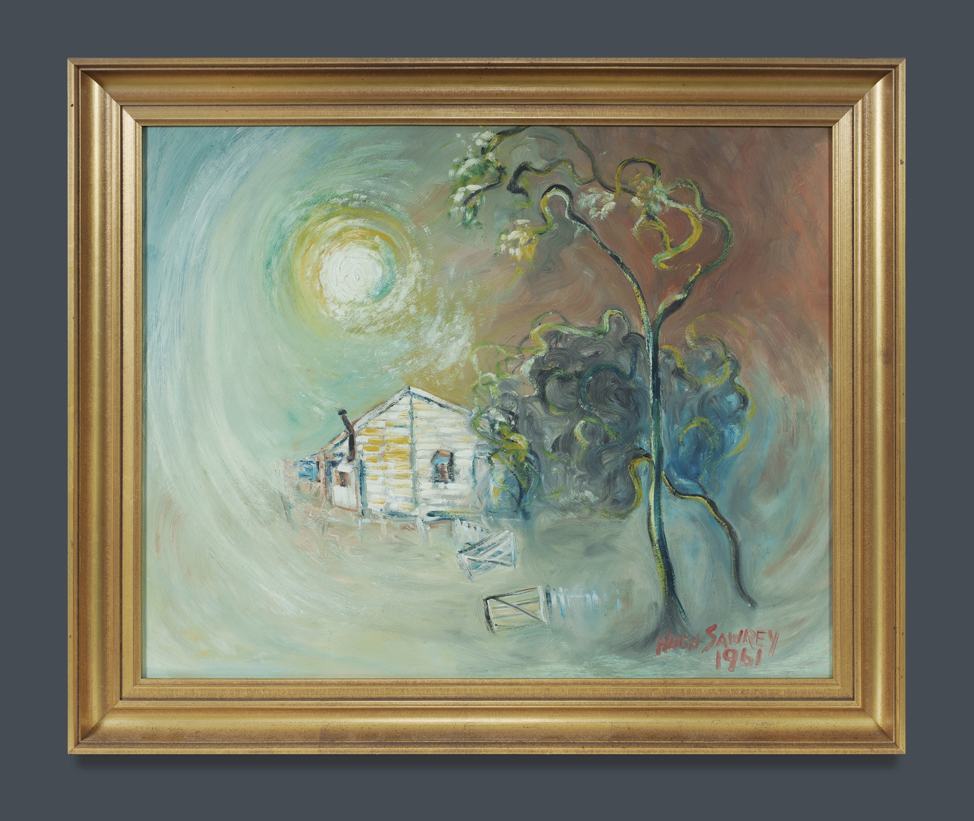 SAWREY, Hugh (1919-1999) 'The Artist's Little Bush Home,' 1961. Signed lower right. Additional signature and title verso. Oil on Board 59x73.5cmEstimate $1,500-2,500