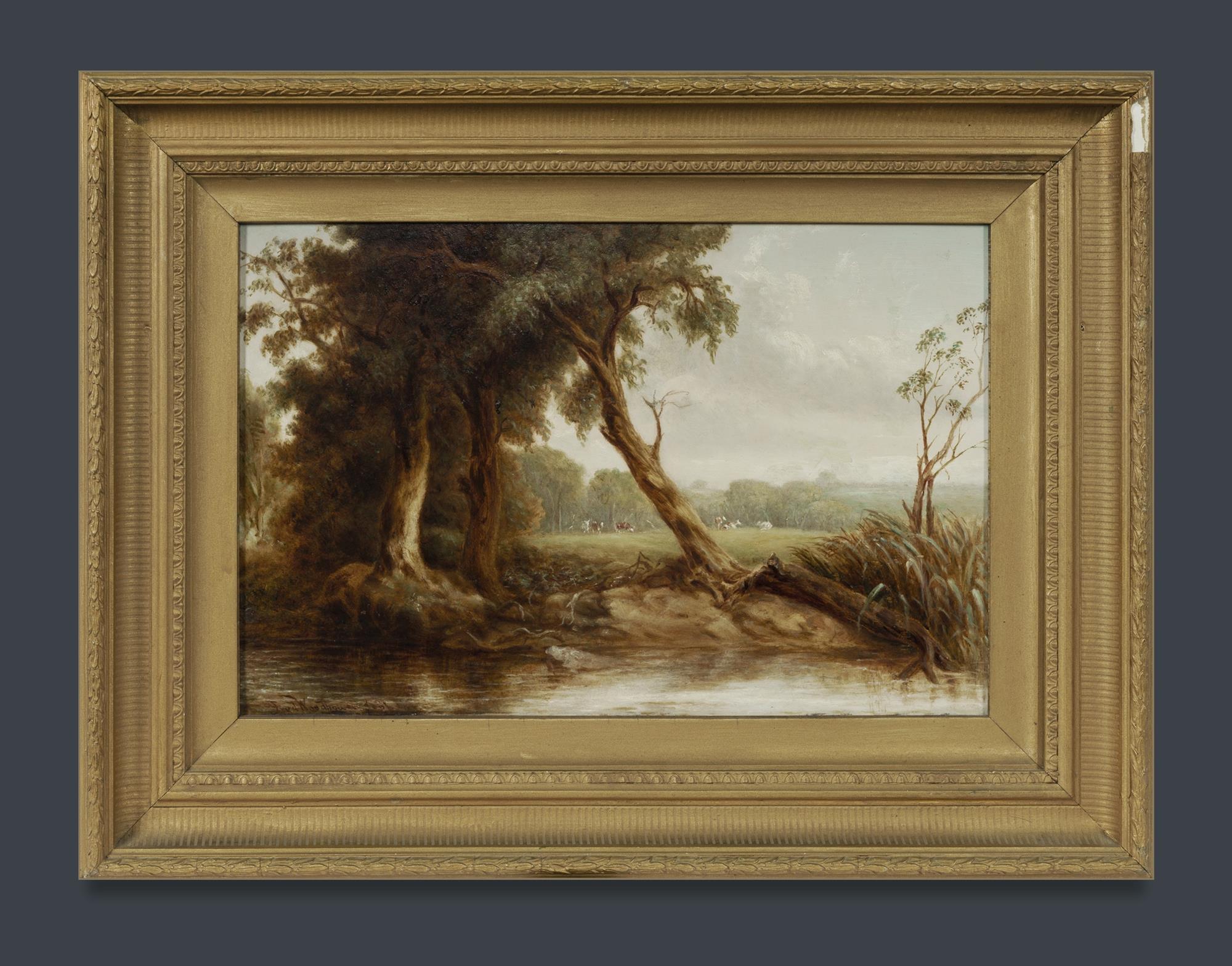 WOODHOUSE, Frederick William (Senior) (British/Australian 1820-1909) On the Riverbank Signed lower left. Oil on Board 30x45.5cm PROVENANCE: Gibson's Auctioneers & Valuers, Melbourne, 24th October 2021 (lot 117)Estimate $1,000-2,000