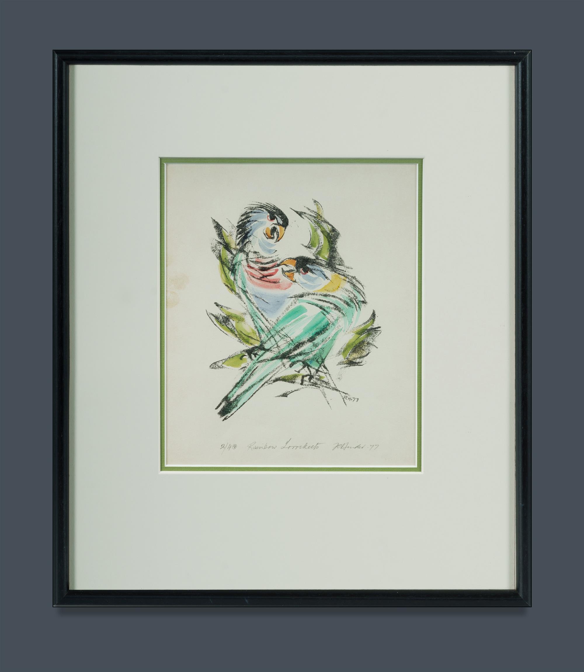 HINDER, F C (Frank) (1906-1992) 'Rainbow Lorikeets,' 1977. Signed lower right. Hand-Coloured Lithograph 2/4 24x20cmEstimate $450-750