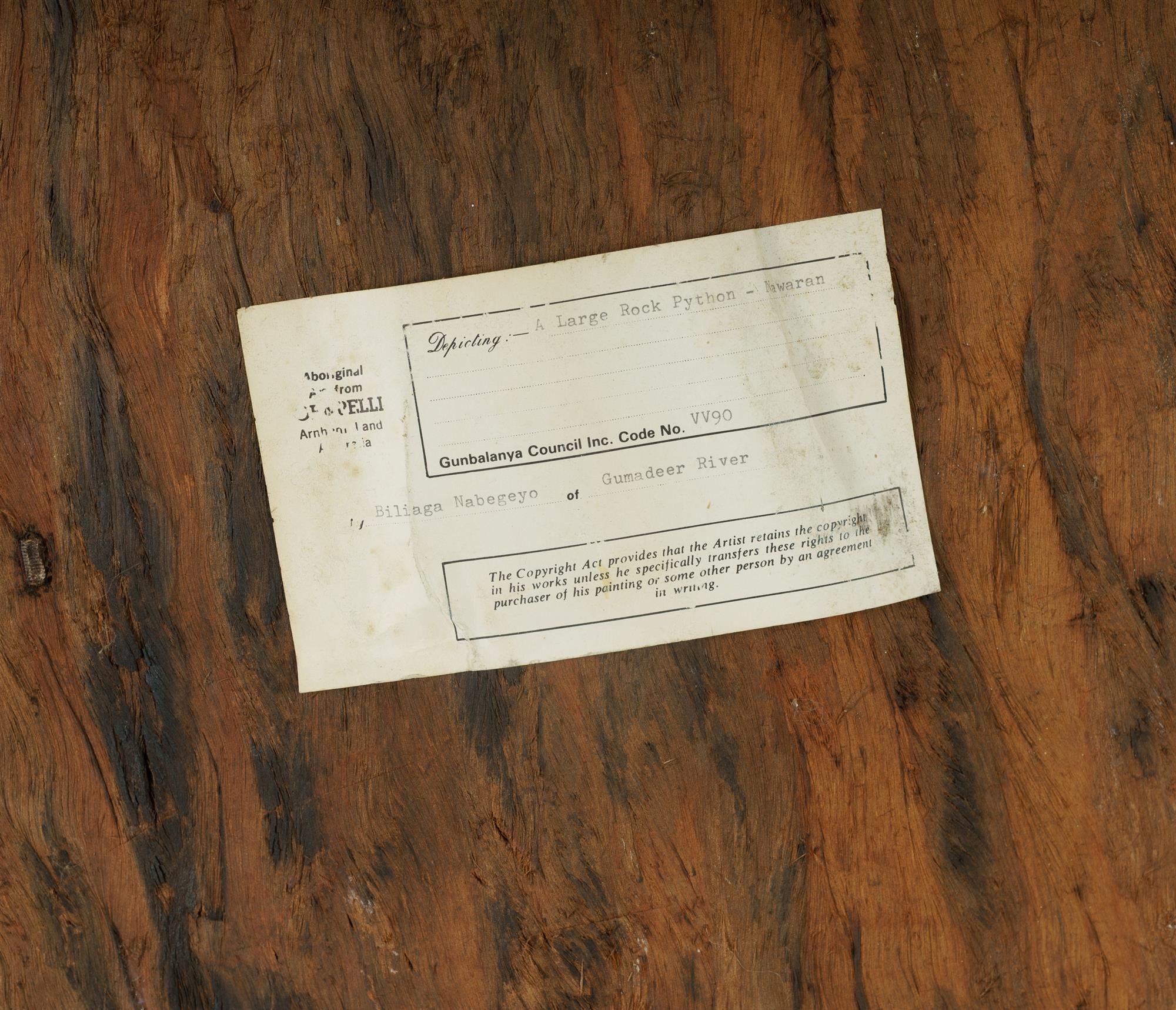NABEGEYO, Biliaga 'A Large Rock Python - 'Nawaren' Oenpelli/Gunbalanya Council Inc. code no. VV90 (label verso) Natural Earth Pigments on Bark 100x56cmEstimate $400-700