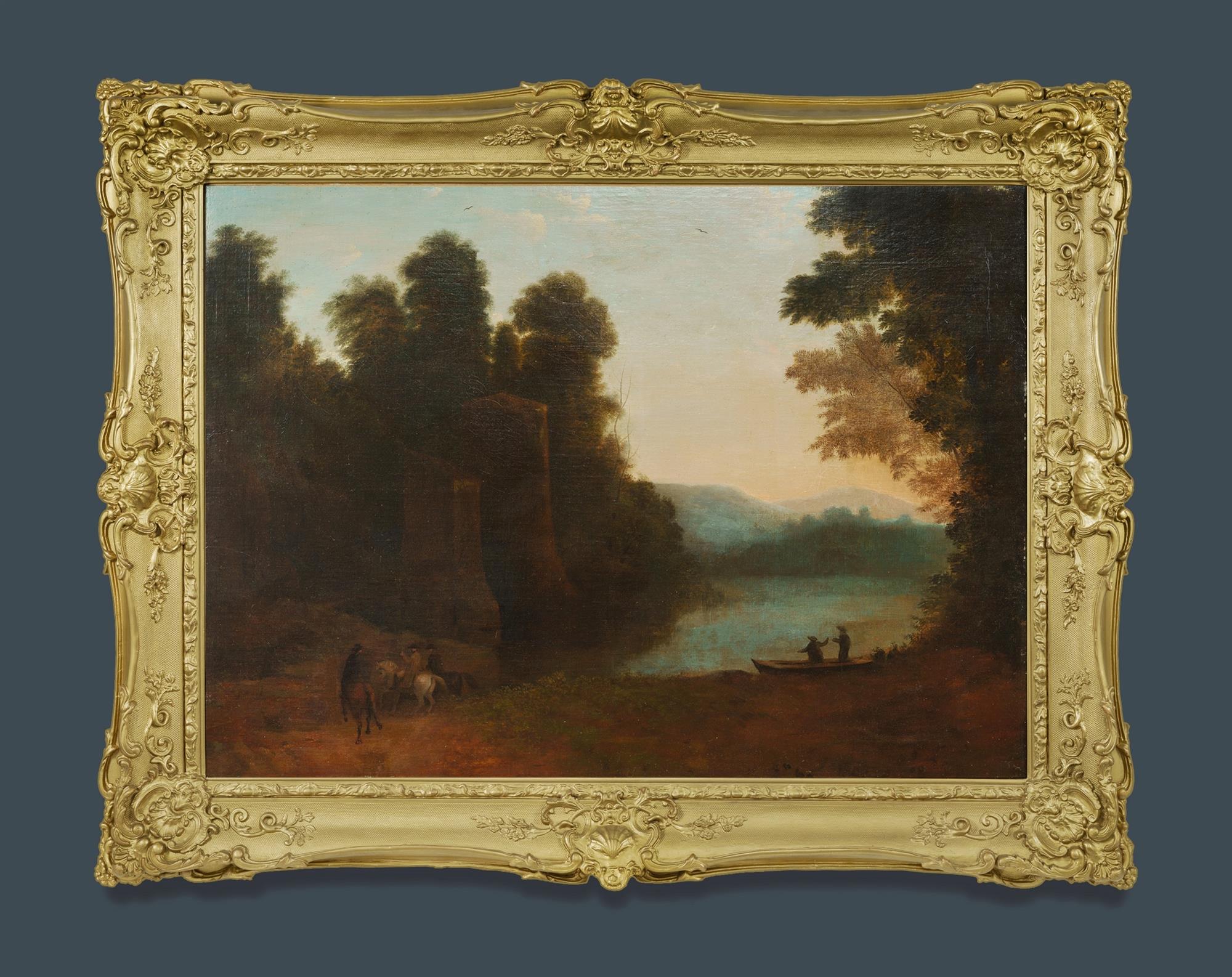 Manner of John GLOVER, (1767-1849) Evening Scene with Figures and Ruins in a Classical Landscape Unsigned Oil on Canvas (relined) 72x100cmEstimate $1,000-2,000