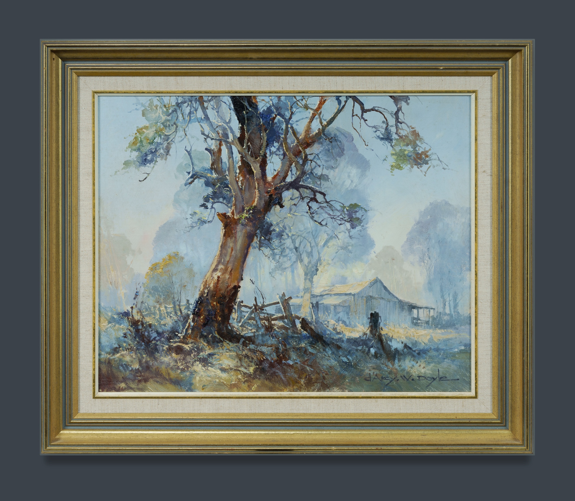DOYLE, d'Arcy (1932-2001) 'Morning - The Old Shed,' c.1980. Signed lower right. Oil on Ply 39.5x49.5cmEstimate $3,000-4,000