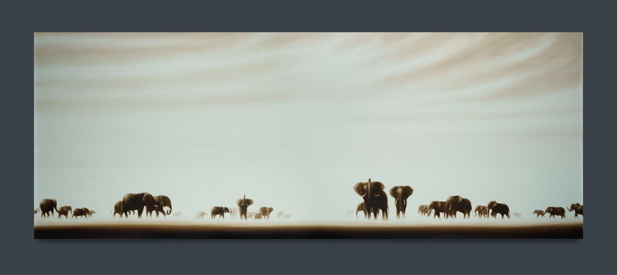 HICKEY, Peter (b.1943) 'Elephant Kingdom,' 2002. Signed lower right. Oil on Canvas 106x280cm PROVENANCE: The artist; Bell Gallery, Berrima, NSW; private collection, NSW.Estimate $1,500-2,500