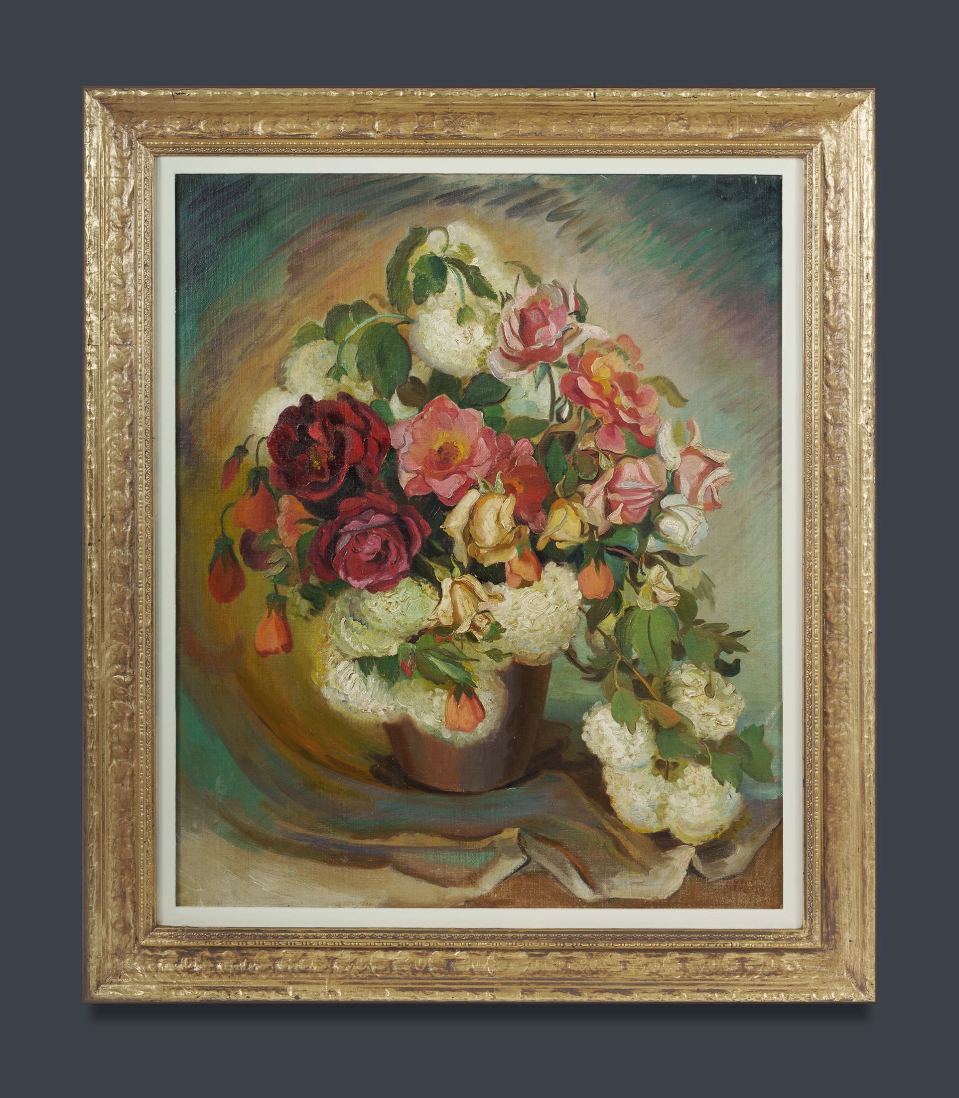 PERRY, Adelaide Elizabeth (1891-1973) Roses and Snowballs,' 1944. Signed lower right. Oil on Canvas on Board 75x62.5cm EXHIBITIONS: Artarmon Galleries, Sydney, November 2017, cat #17.Estimate $1,800-3,000