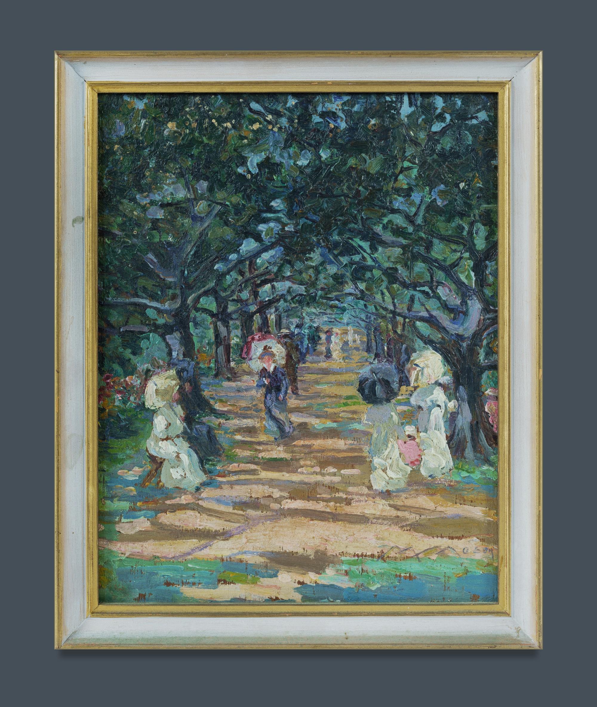 Signed M. Mason (?) Afternoon Stroll Down Tree-Lined Path Signed lower right. Additional picture verso of children playing in fenced garden. Oil on Board 21.5x17cmEstimate $200-400