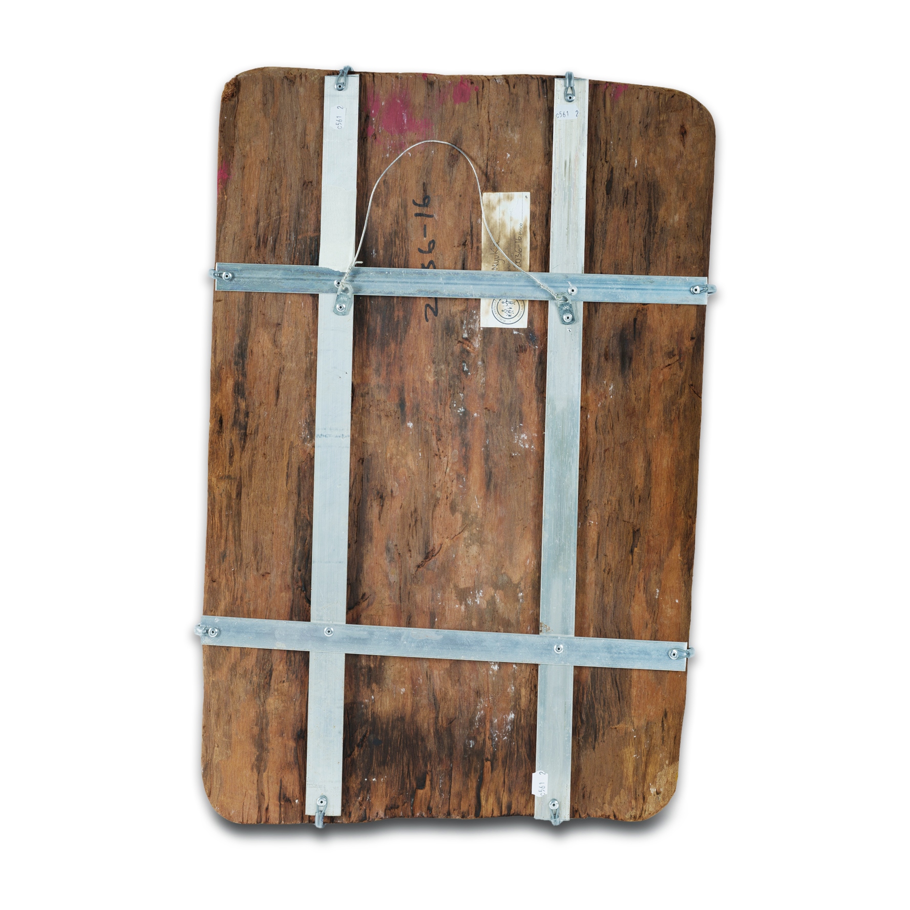 MARAWILI, Nyuka (Aboriginal born c.1963) Untitled (Fish), 2016. Earth Pigments on Bark 53x36cm PROVENANCE: Buku-Larrnggay Mulka Centre, Nhulunbuy NT cat #2036-16 (certificate included); Collection Rev. Dr Arthur Bridge AM OAM.Estimate $100-200