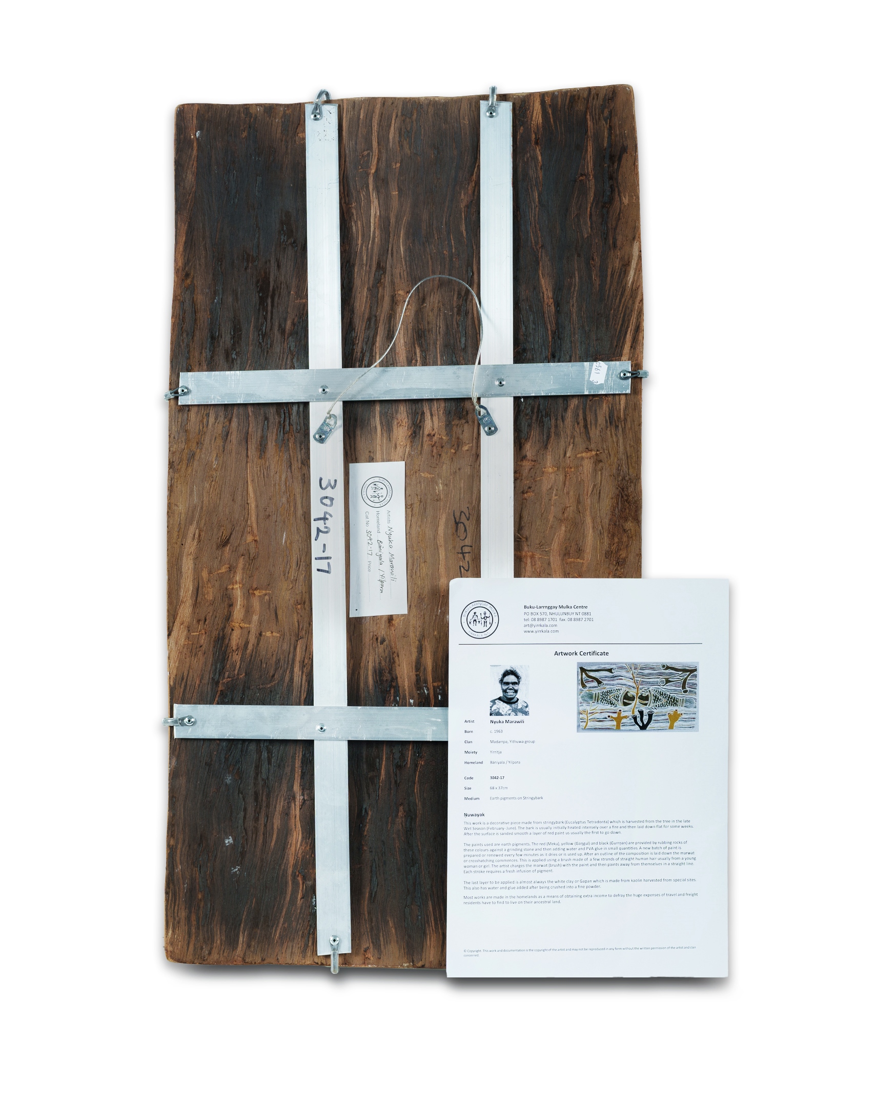 MARAWILI, Nyuka (Aboriginal born c.1963) Untitled (Fish), 2017. Earth Pigments on Bark 67x36cm PROVENANCE: Buku-Larrnggay Mulka Centre, Nhulunbuy NT cat #3042-17 (certificate included); Collection Rev. Dr Arthur Bridge AM OAM.Estimate $150-250