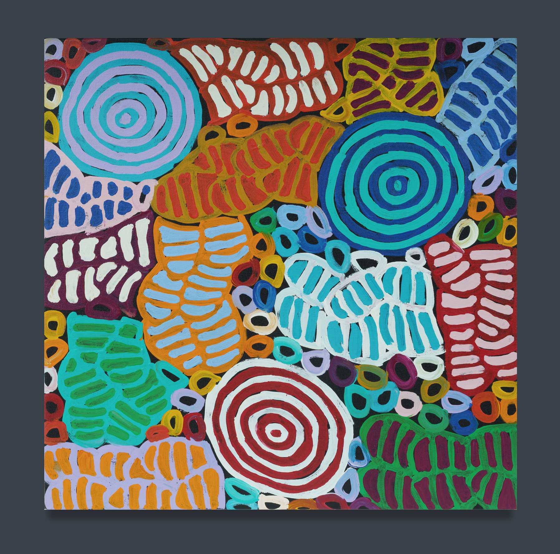MPETYANE (MBITJANA), Dora (Aboriginal b.1965) 'My Mother's Story,' 2023. Acrylic on Canvas 59x59cm PROVENANCE: Mbantua Gallery, Alice Springs NT cat #MB60662 (certificate & photo included); Collection Rev. Dr Arthur Bridge AM OAM.Estimate $200-400