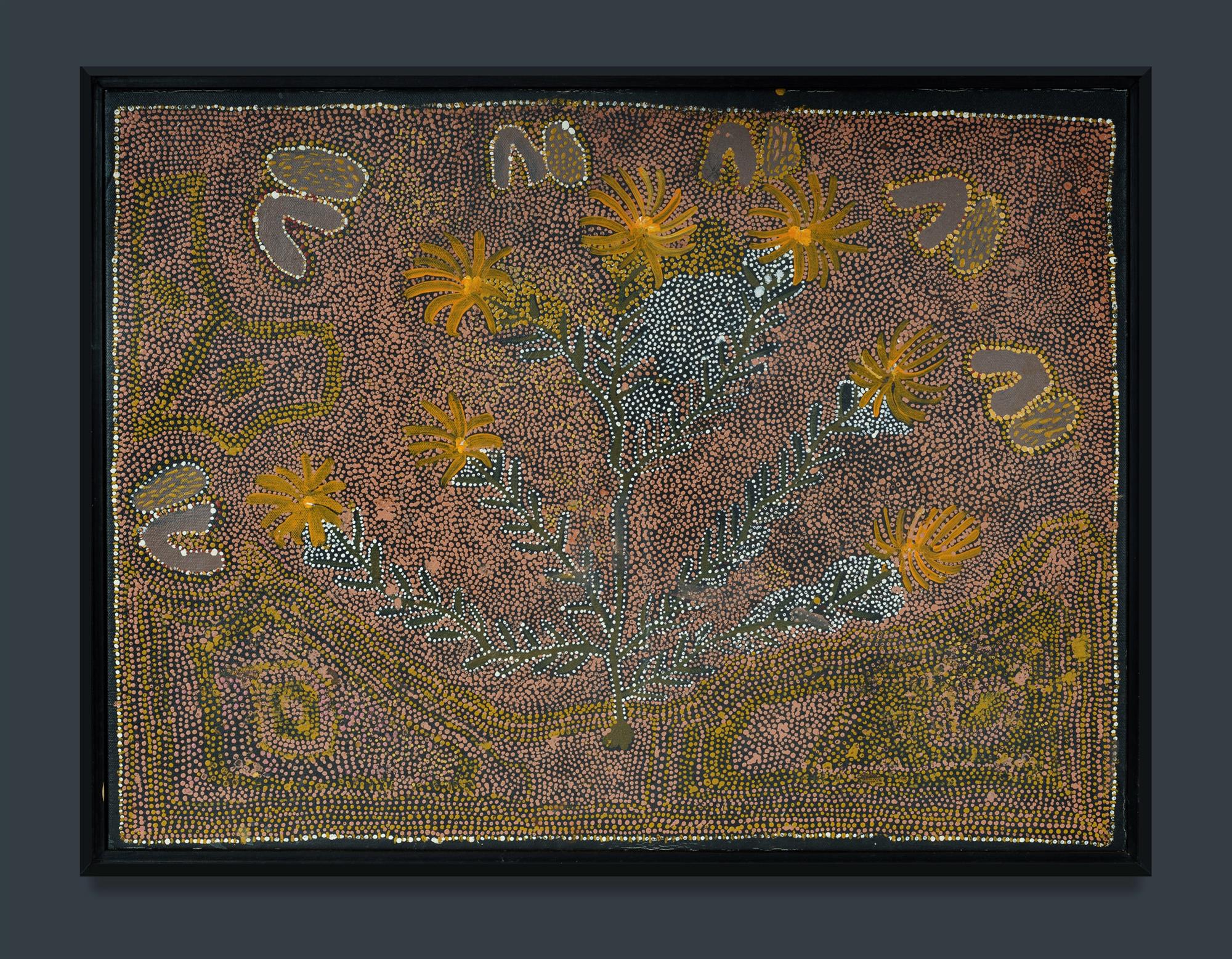 KNGWARREYE, Weida (Aboriginal born c.1920s) 'Tharrkarr - Honey Grevillea' Illegible inscription verso. Acrylic on Canvas 61x45.5cm PROVENANCE: Mbantua Gallery, NT cat #MB12192; Collection Rev. Dr Arthur Bridge AM OAM.Estimate $200-400