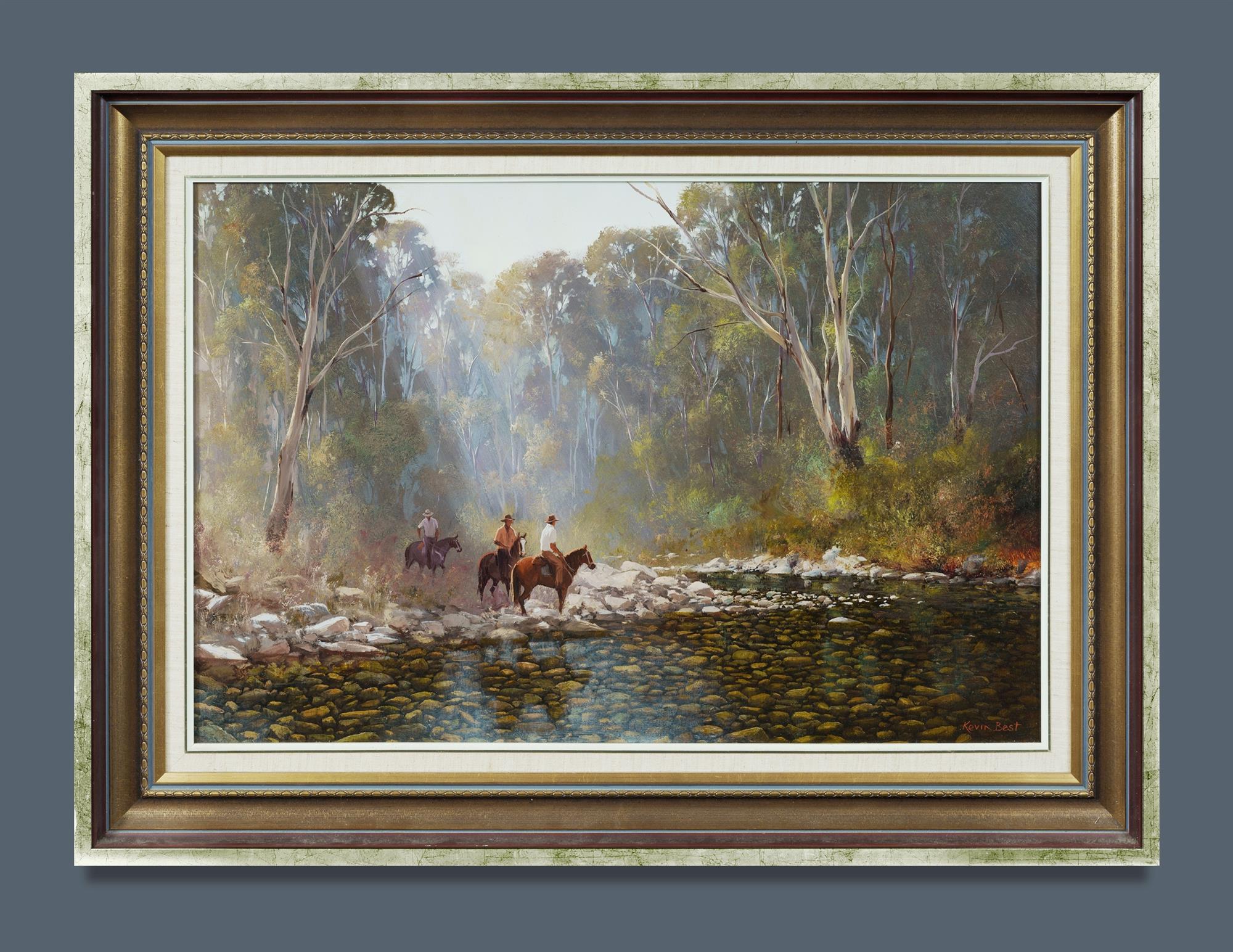 BEST, Kevin (1932-2012) 'The Search Party, Delatite River' Signed lower right. Oil on Board 50x75cmEstimate $1,800-3,500