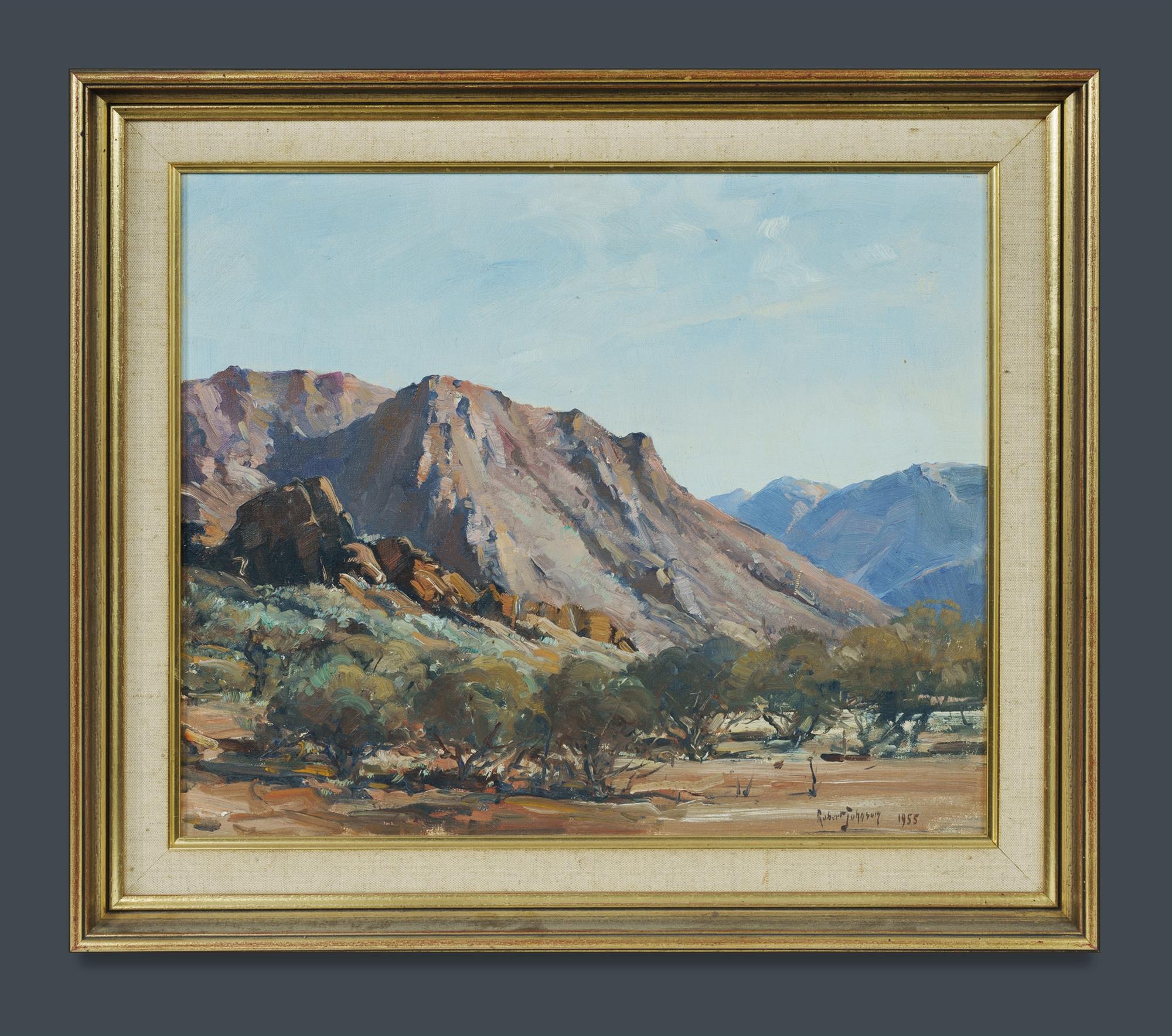 JOHNSON, Robert (1890-1964) Mountain and Mulga, 1955. Oil on Canvas on Board 36x44cm PROVENANCE: Christie's, Sydney, October 3rd 1972 (lot 259); Collection Mr H & Mrs P Wallace, Sydney.Estimate $500-800