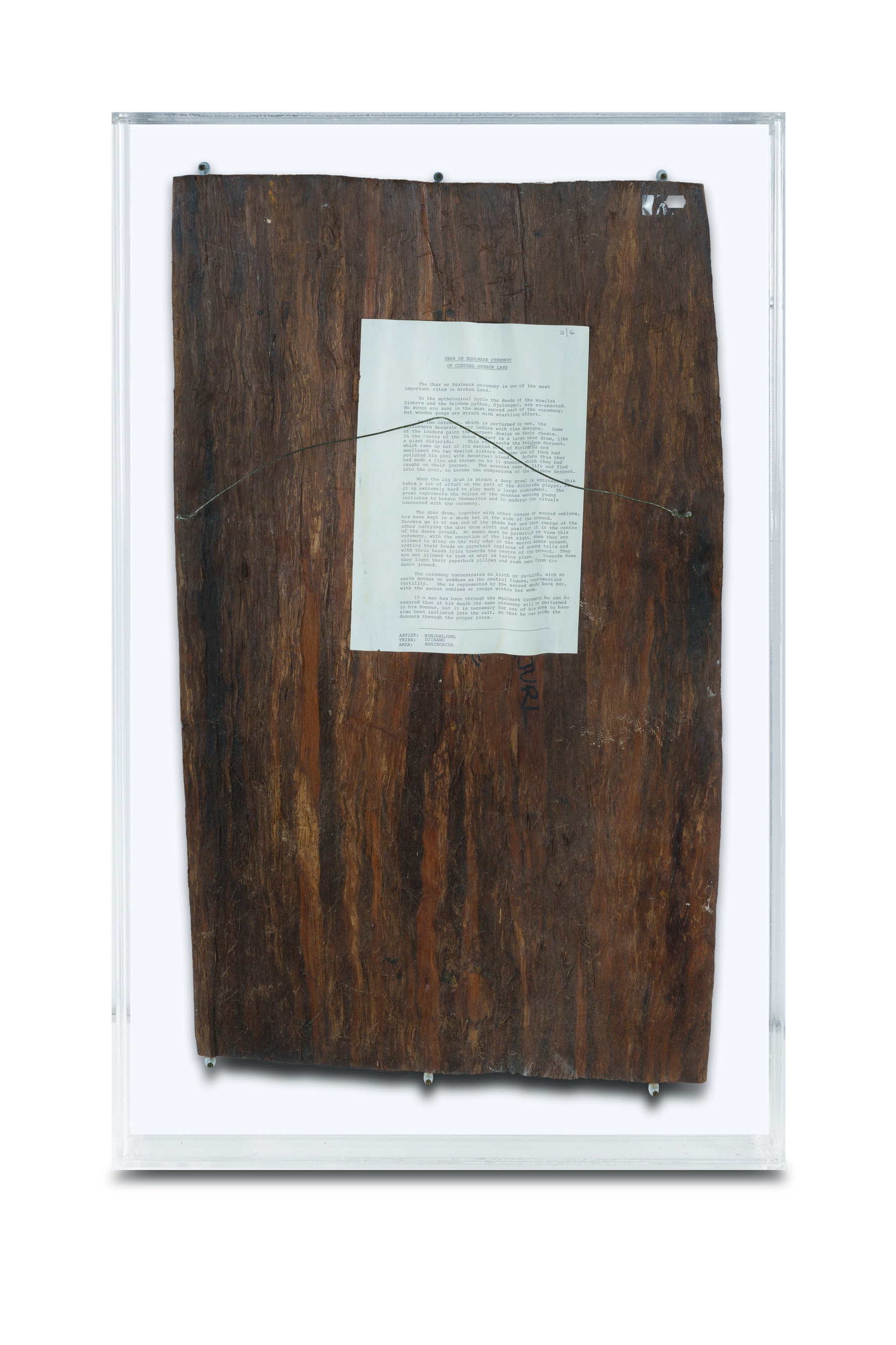 BUNJURLJURL 'Ubar or Ngulmark Ceremony of Central Arnhem Land,' c.1975. Documentation sheet verso. Dorothy Bennett collection (possibly no.108) Natural Earth Pigments on Eucalyptus Bark 80x49cm PROVENANCE: Dorothy Bennett, 1975; Collection Mr H & Mrs P Wallace, Sydney (acquired 1981)Estimate $600-1,000