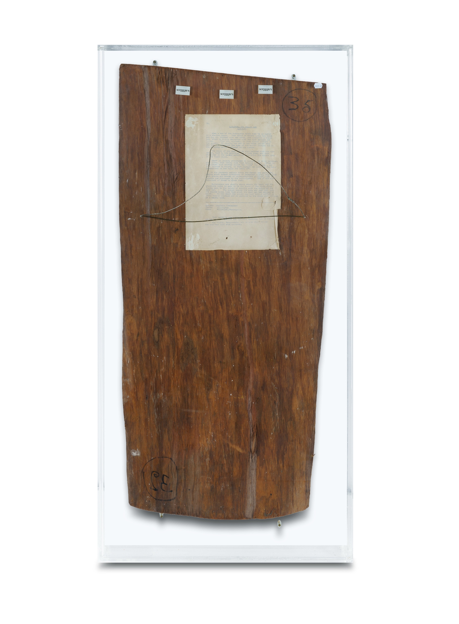 JARABILI, Charlie (c.1920-1985) 'Djalambu, Hollow Log Ceremony,' 1958. Bears Dorothy Bennett Collection number 35 together with extensive documentation on label on reverse Natural Earth Pigments on Eucalyptus Bark 97x46cm