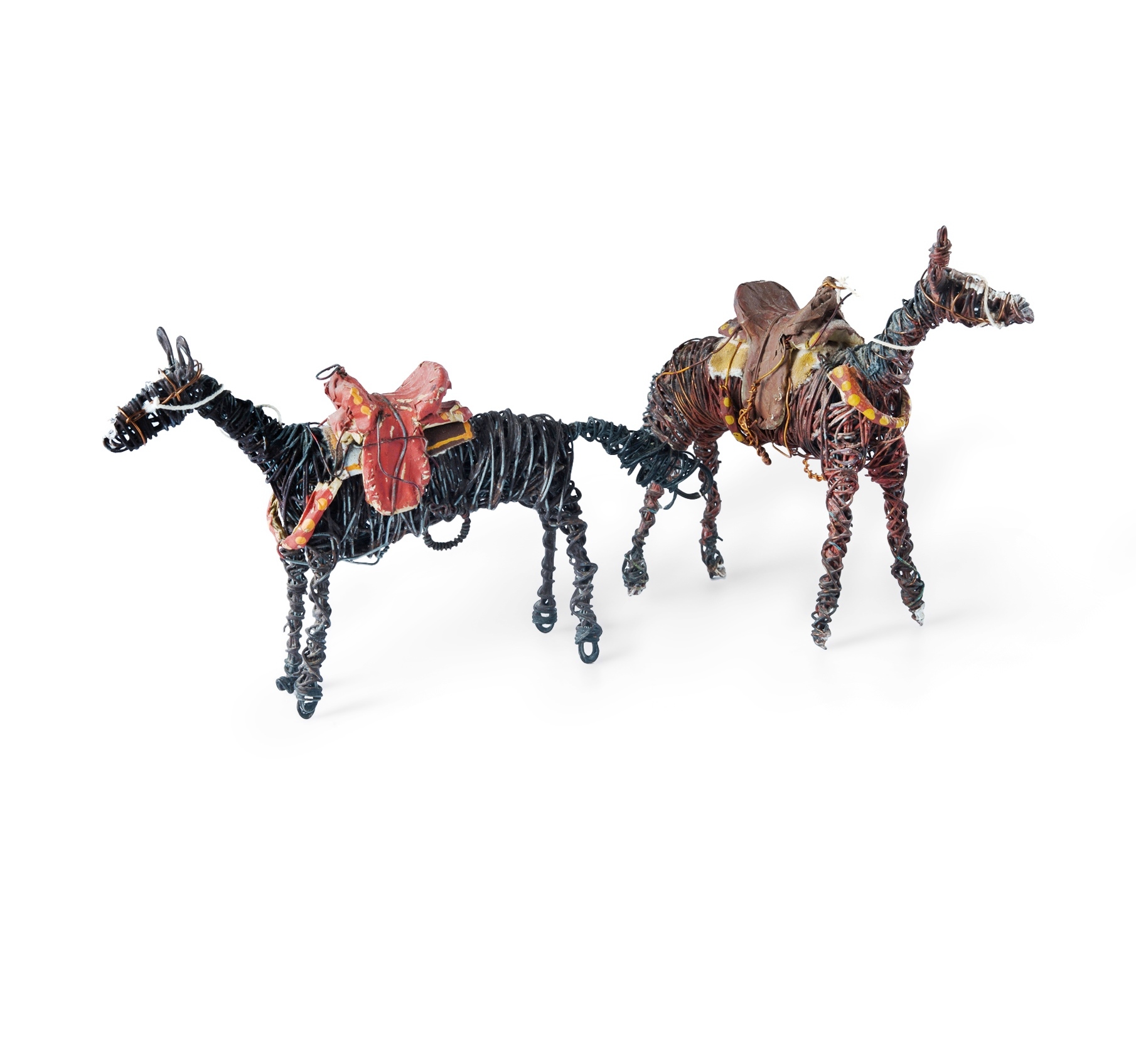 PERRURLE, Johnny Young (Aboriginal b.1964) Two Stock Horses Together with a copy of 'Bush Toys: a Collection of Toys from Eastern Arrernte Communities in Central Australia' Wire & Mixed Media L18cm (each)Estimate $300-500