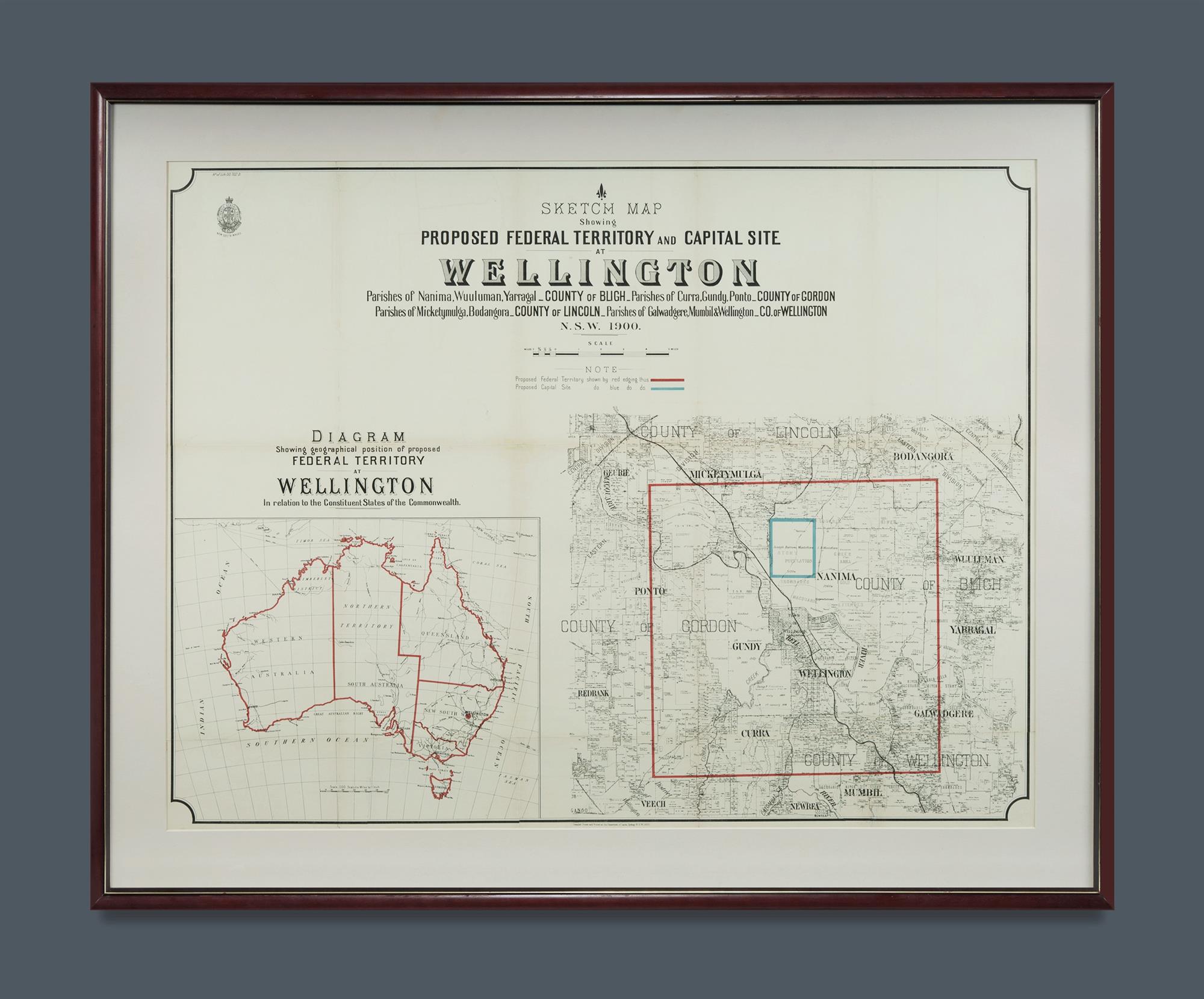 'Sketch Map Showing Proposed Federal Territory and Capital Site at Wellington,' 1900. Compiled, drawn and printed at the Department of Lands, Sydney NSW. (Print)Estimate $300-500