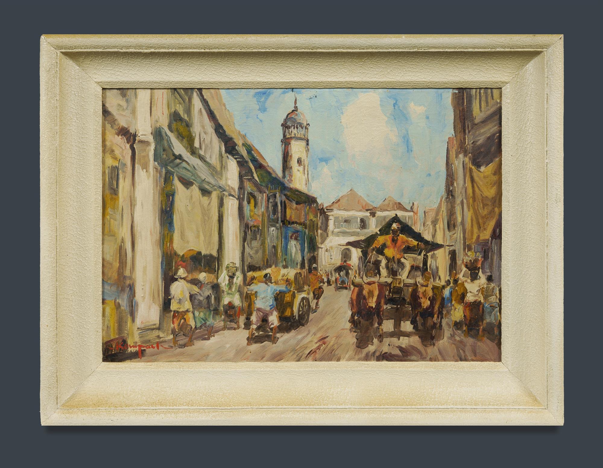 KOEMPOEL, Sujatno (Indonesian 1912-1987) Ox Cart and Street Traders Signed lower left. Oil on Canvas 40.5x58.5cmEstimate $250-450