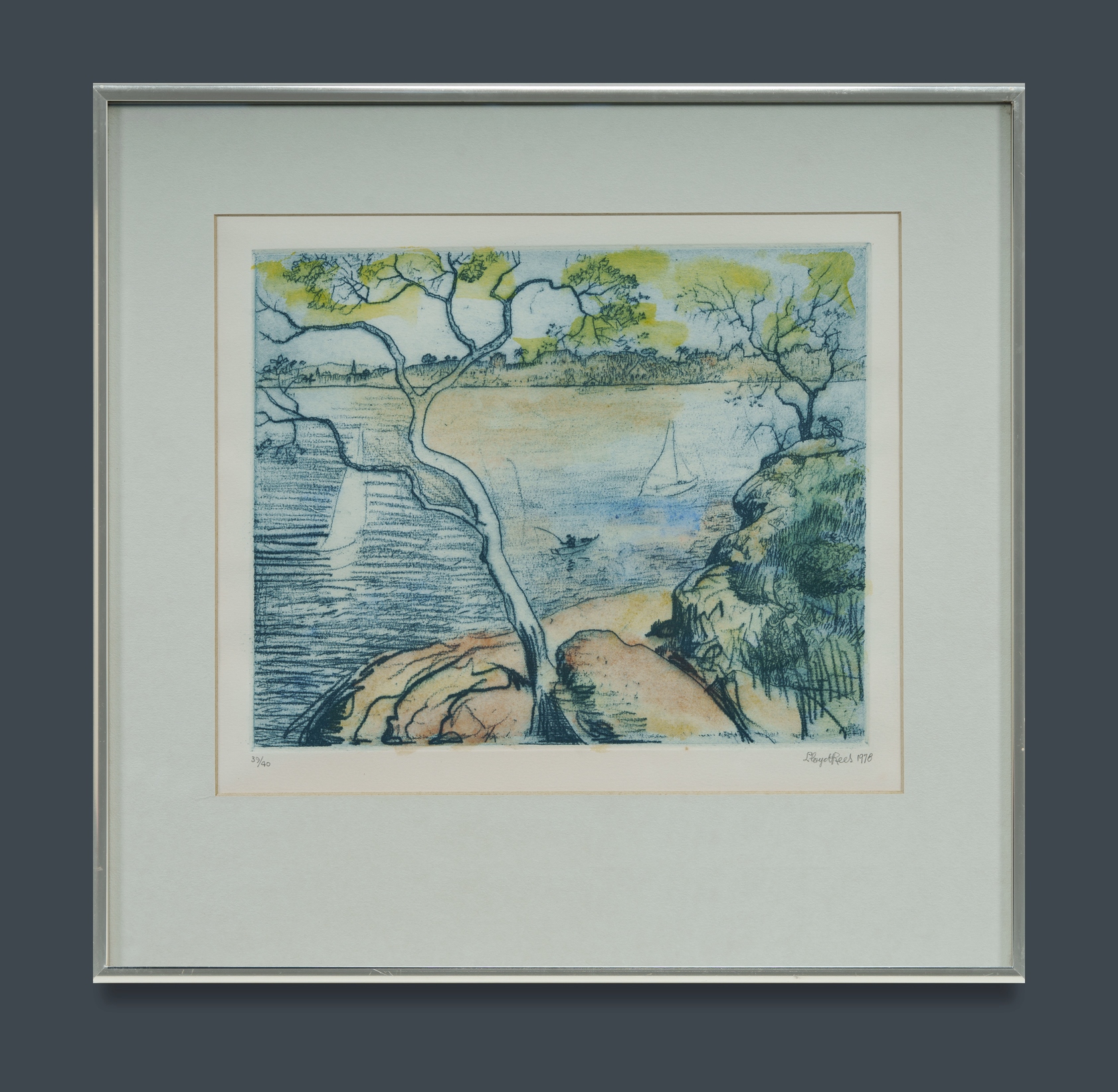 REES, Lloyd (1895-1988) 'Northwood Point with Tree,' 1978. Signed lower right. Hand-colouring by David Rankin. Hand Coloured Etching 39/40 24.5x30cm PROVENANCE: Collection of Jim Haynes OAM and Robyn McMillan. LITERATURE: Hendrik Kolenberg, 'Lloyd Rees - Etchings and Lithographs', The Beagle Press, Sydney, 1986, p.50 (#30)Estimate $350-550