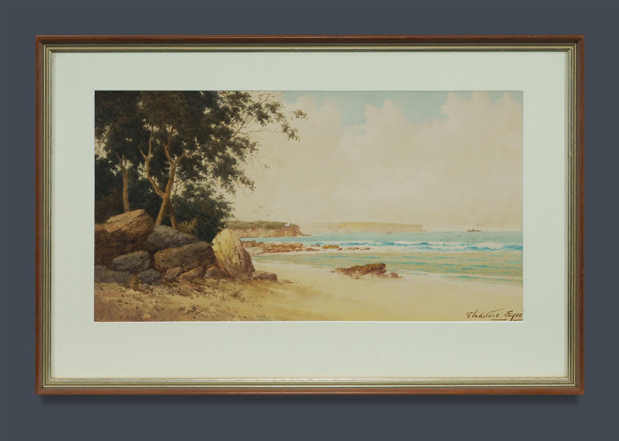EYRE, Gladstone (1863-1933) 'Balmoral Beach (with View to Dobroyd Head and North Head) Signed lower right. W/Clr 30.5x57cm PROVENANCE: Davidson Auctions, May 23rd 2015 (lot 91); Collection of Jim Haynes OAM and Robyn McMillan.Estimate $200-400