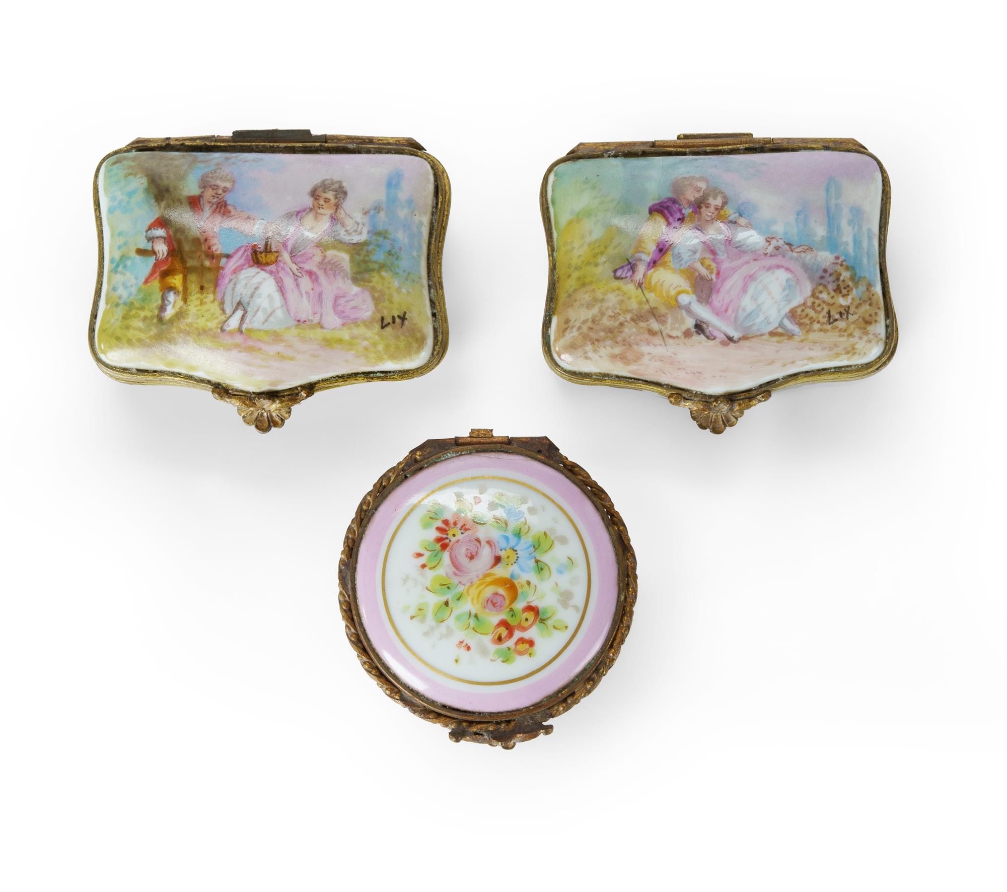 3 Early 20th C French Porcelain Pill Boxes Includes 2 sevres boxes with hand-painted hinged covers, signed 'Lix' (L5.5cm); and a limoges box with floral decorated lid (Dia.4.3cm)Estimate $40-80