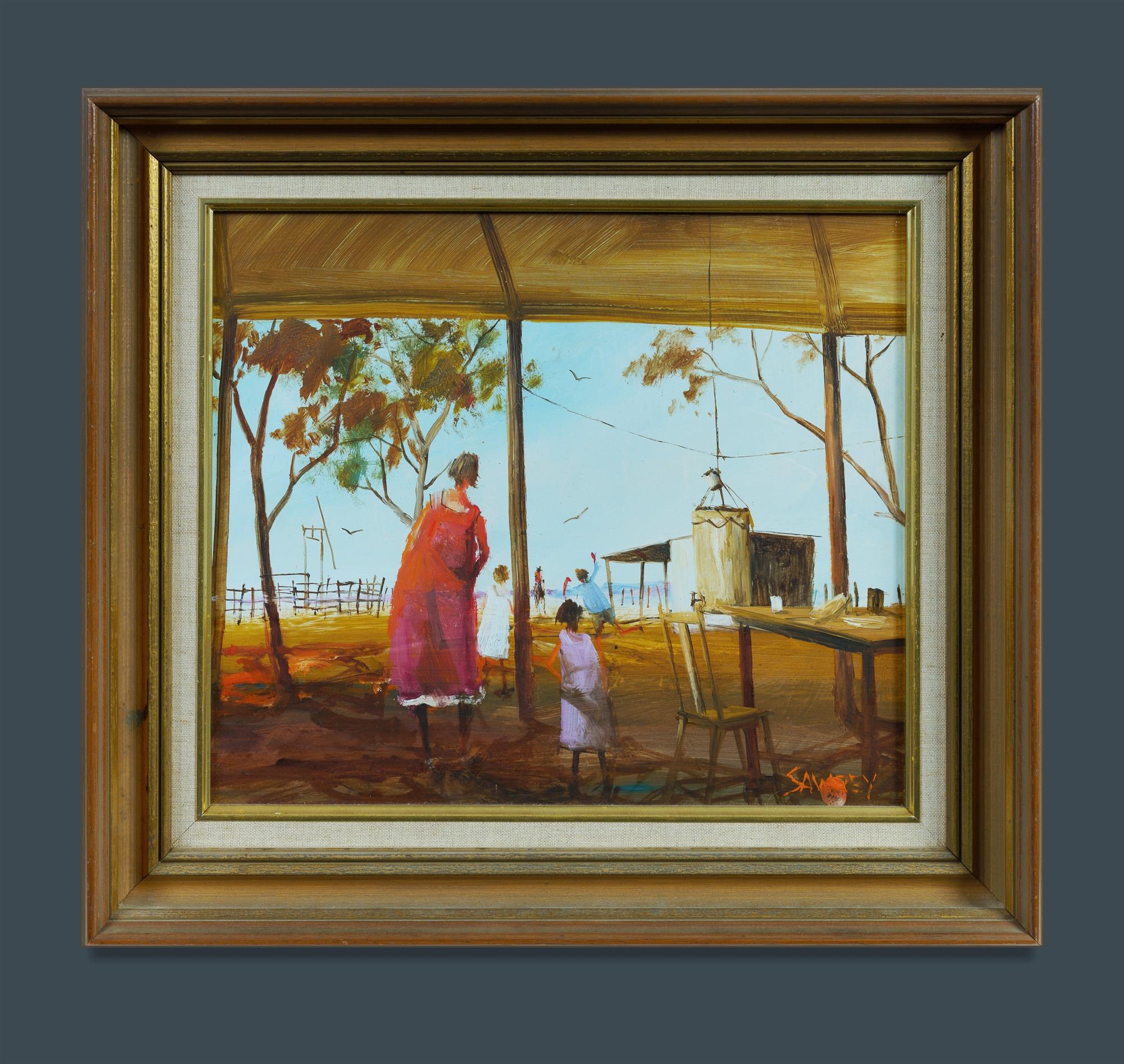 SAWREY, Hugh (1919-1999) 'When Dad Comes Riding Home,' from the Boundary Riders Series. Signed lower right. Titled verso. Oil on Board 29.5x34.5cm PROVENANCE: Sotheby's, Melbourne, May 5th 2003 (lot 248); private collection, Sydney.Estimate $2,500-3,500