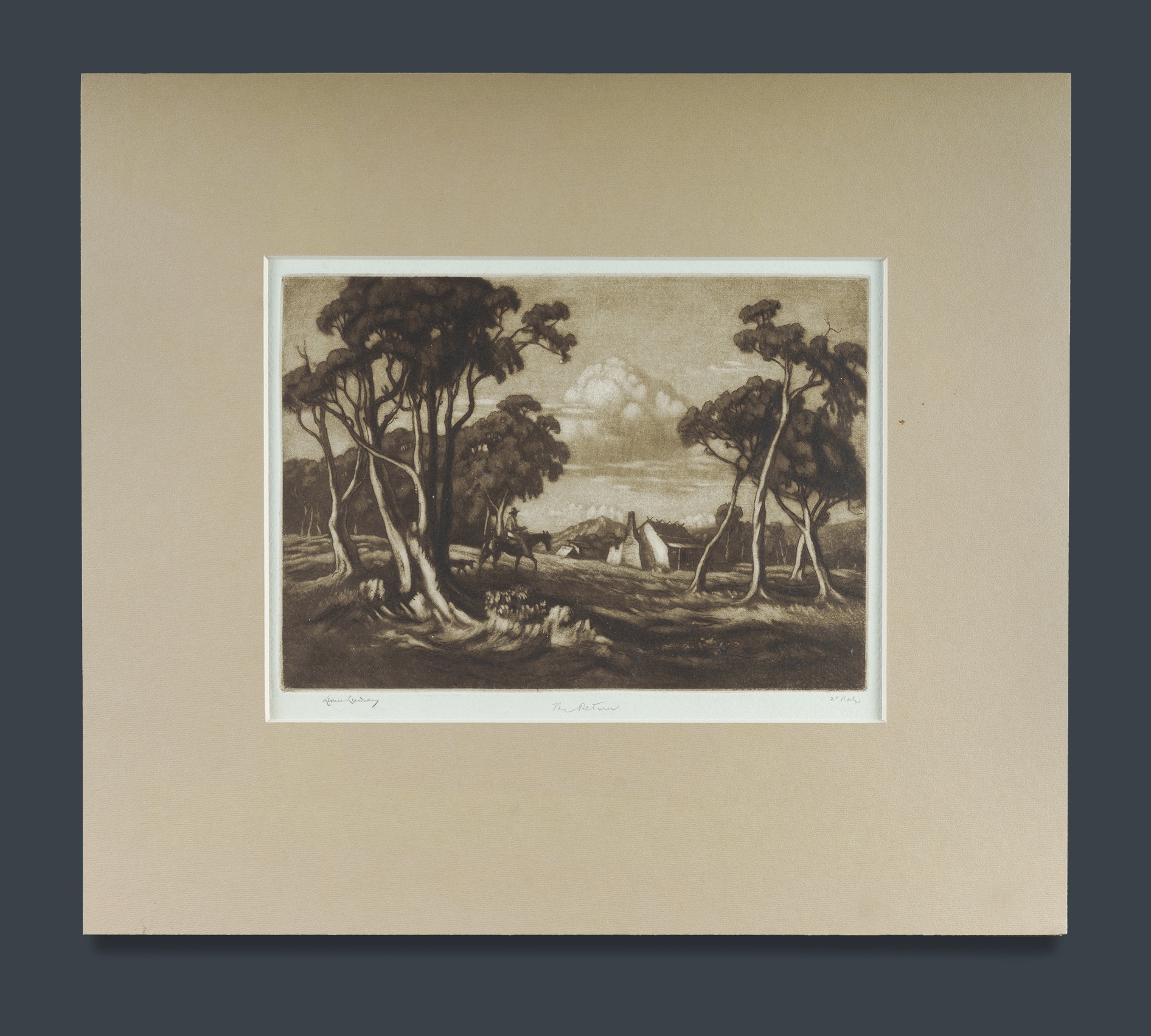 LINDSAY, Lionel (1874-1961) 'The Return,' c.1948-50. Signed lower left. Etching & Mezzotint in Brown Ink - 2nd State (ed. of 50 plus proofs) 17x24cm (plate)Estimate $200-400