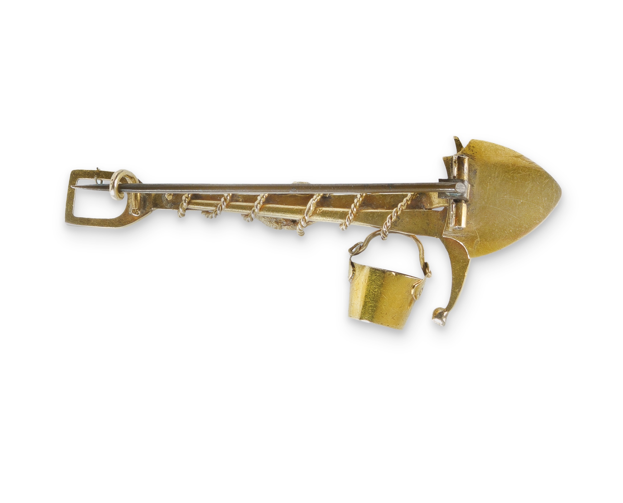 Pink Gold Goldfields Brooch Goldfields brooch featuring pick, shovel, bucket, rope, and gold nugget motif. Acid tested as approx. 15ct gold. Dimensions approx. (5.6x2.3cm) and weighs approx. (5.5g)Estimate $400-700