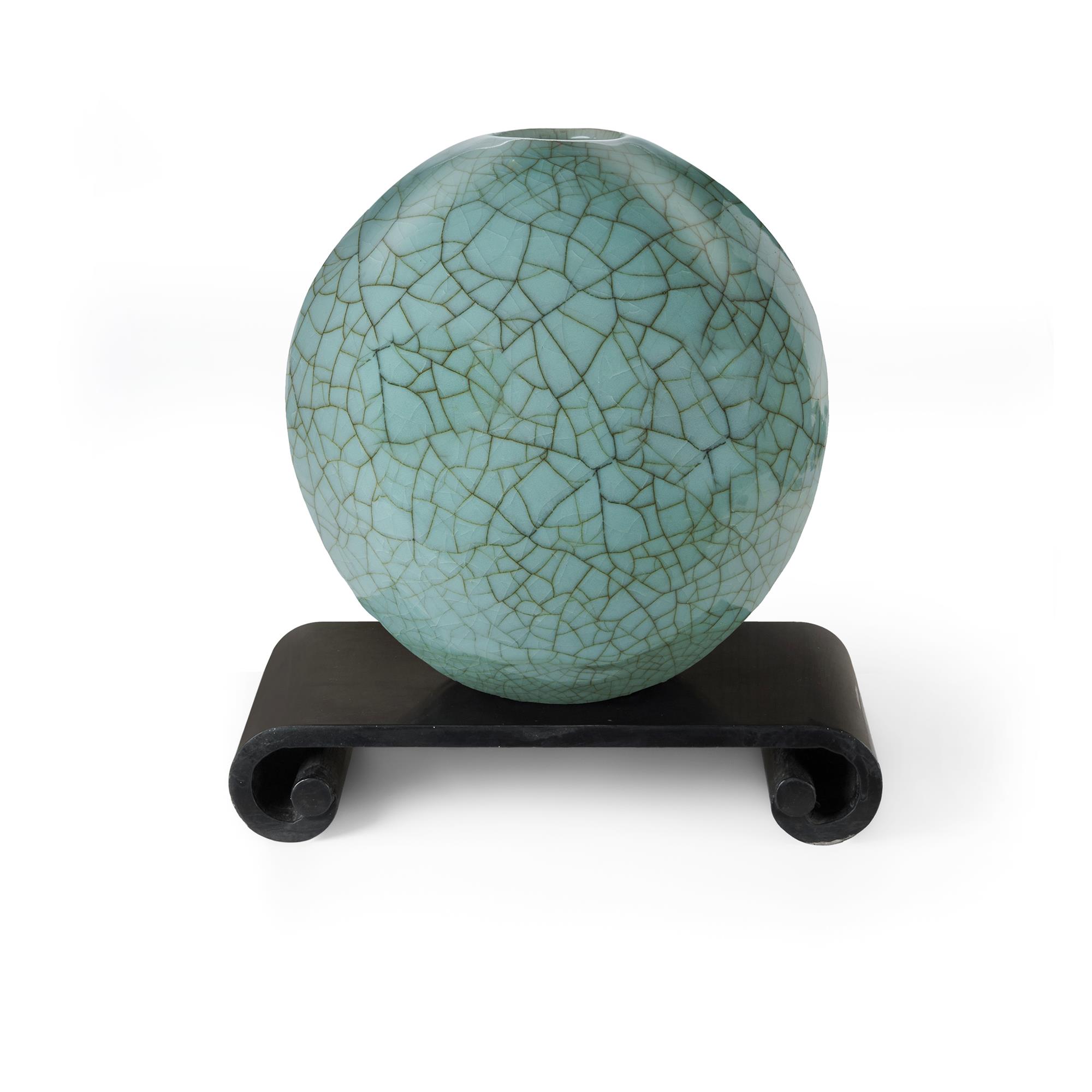 UICHI, Shimizu (Japanese 1926-2004) Large Spheroid Celadon Vase with Crackle Glaze Impressed studio stamp to base. Displayed on wooden stand. In kiri wood (paulownia) 'tomobako' box. (H33.5cm)Estimate $500-800