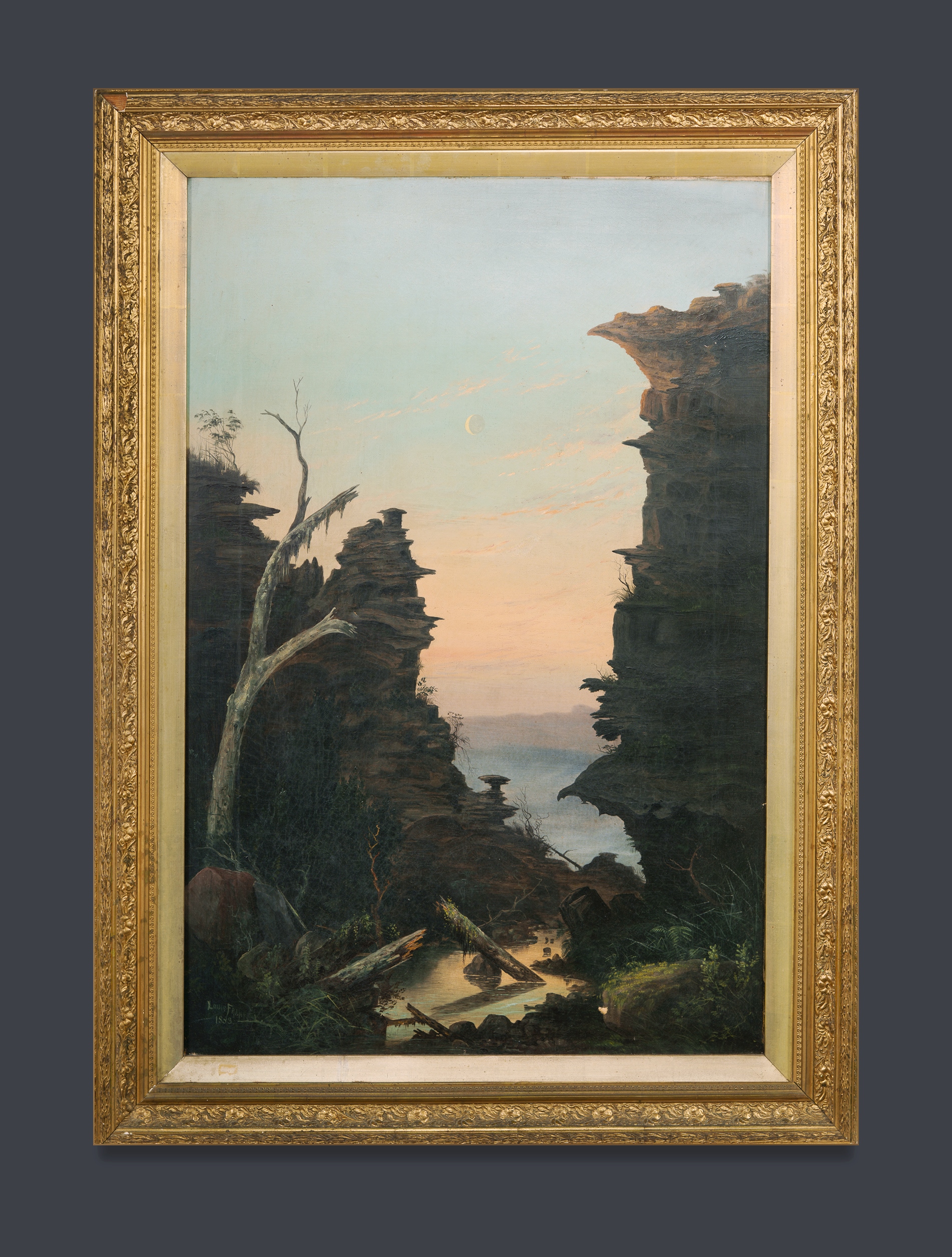 FRANK, Louis (c.1830-1923) Blue Mountains Ravine in Moonlight, 1883. Signed and dated lower left. The Crown Studios, Sydney, label verso. Oil on Canvas 91x60.5cm