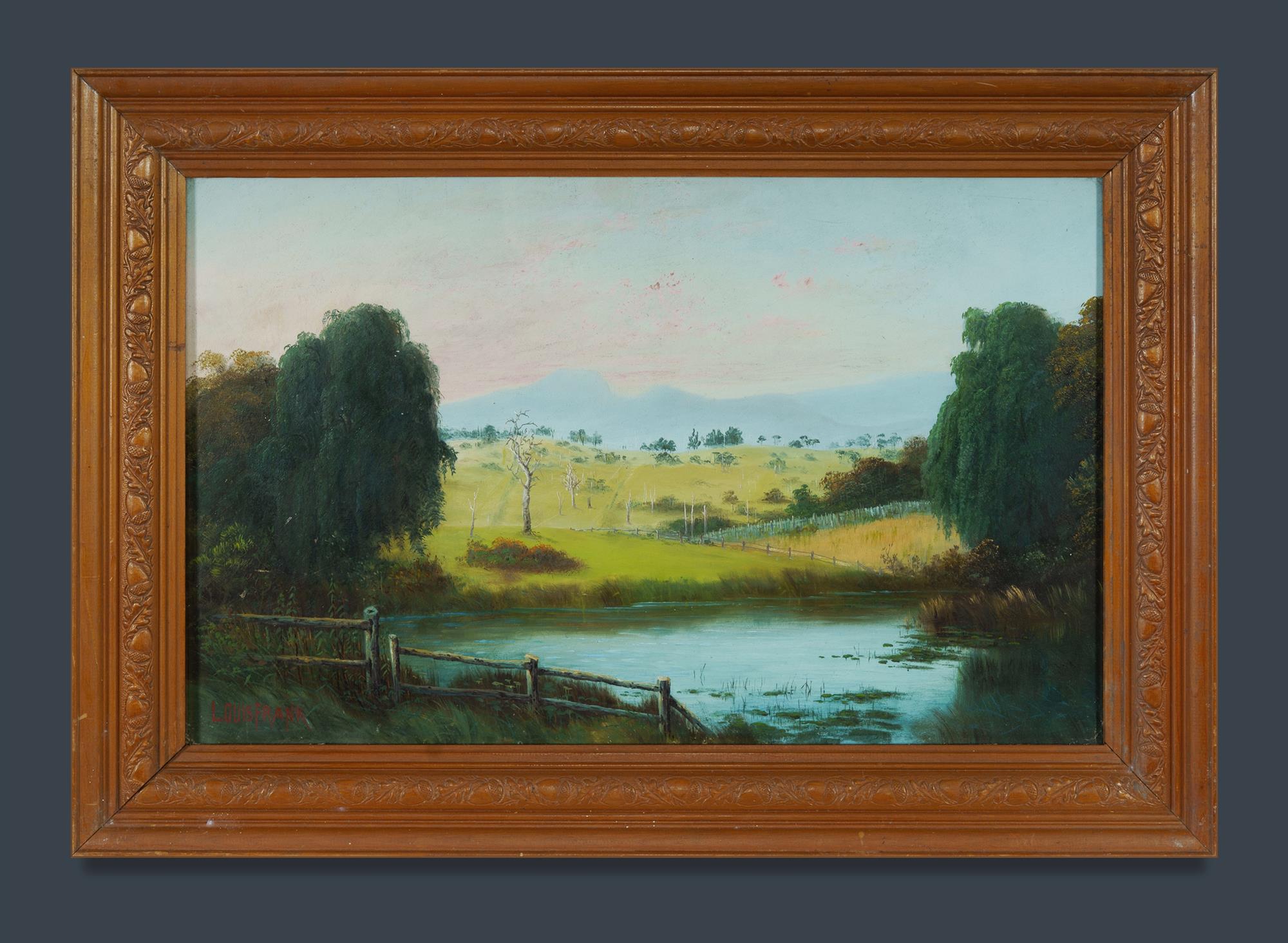 FRANK, Louis (c.1830-1923) Creek and Fields Landscape Signed lower left. Note: framed under glass. Oil on Board 37x59.5cm PROVENANCE: Davidson Auctions, February 6th 2010 (lot 337) Estimate $100-200