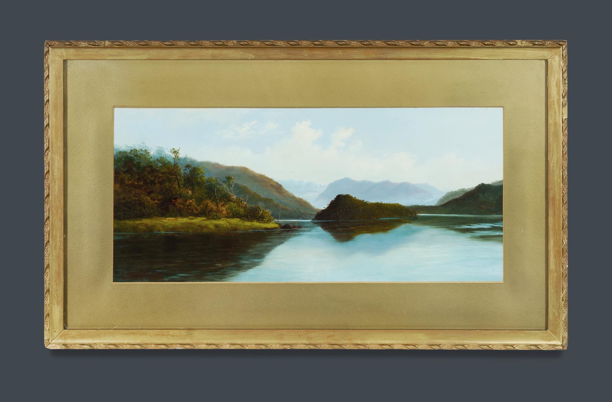 FRANK, Louis (c.1830-1923) New Zealand Lake with View to Mountains Signed lower left. Oil on Board 27x60cmEstimate $150-300
