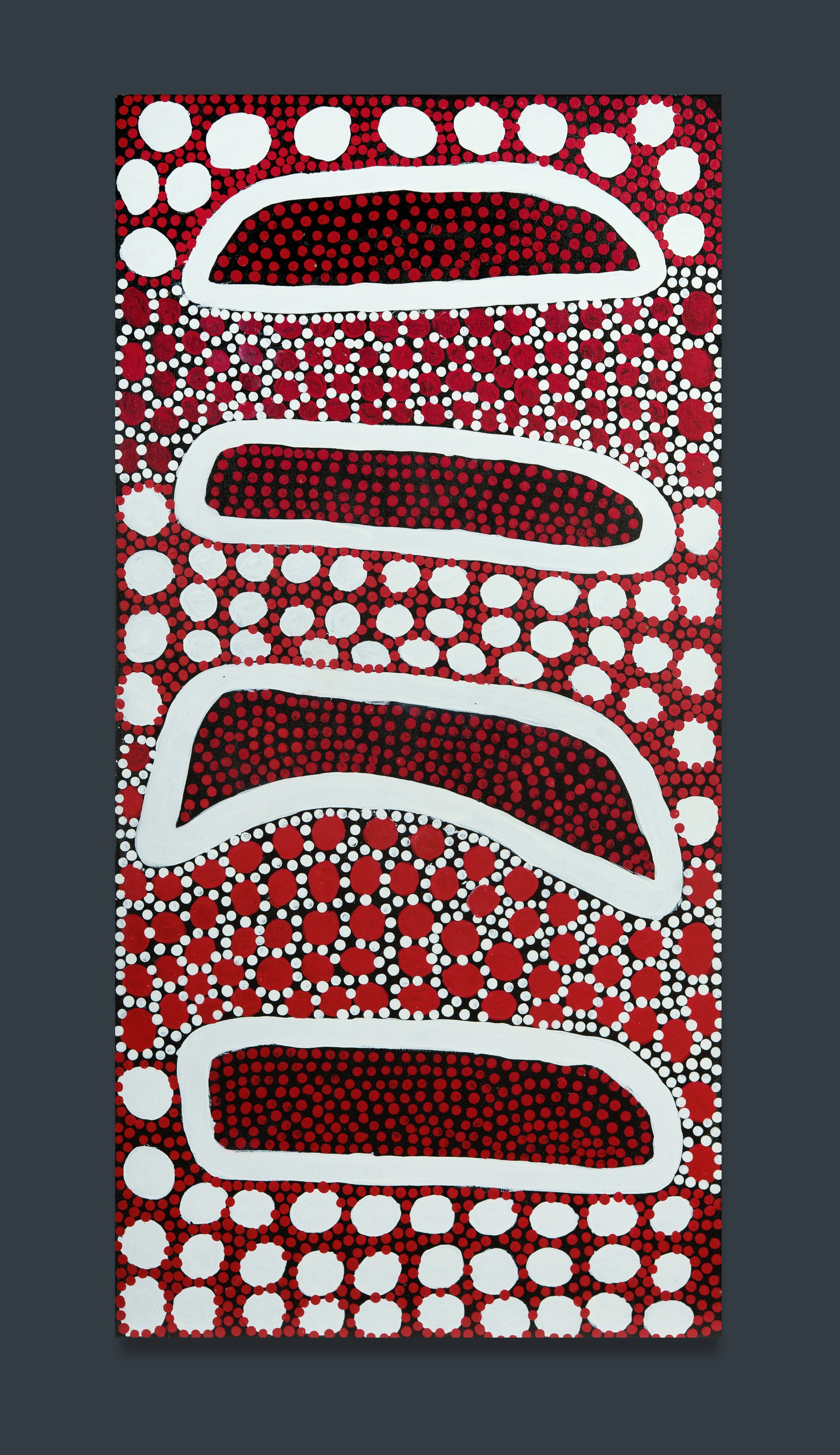 WATT, Joseph (Aboriginal b.1937) 'Rock Cod,' 2005. Inscribed verso with cat #200/C/JW/0405. Acrylic on Canvas 122.5x60cm PROVENANCE: Mornington Island Arts and Crafts Centre (stamped verso); GRANTPIRRIE, Sydney; private collection, Sydney.Estimate $400-700