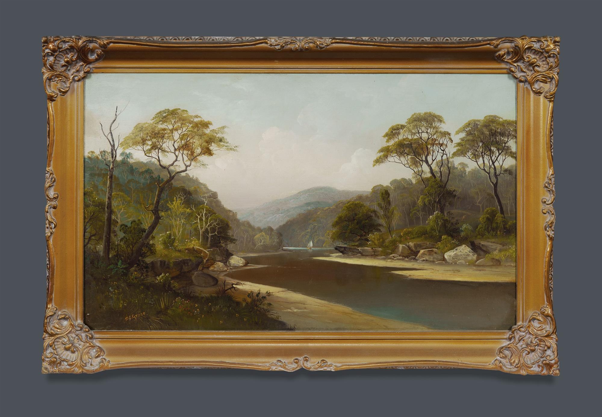 GROSE, Daniel Charles (British 1838-1890) 'Ku-ring-gai Chase' Signed lower left. Old Cascade Galleries label verso. Oil on Canvas on Board 45x75cmEstimate $400-700