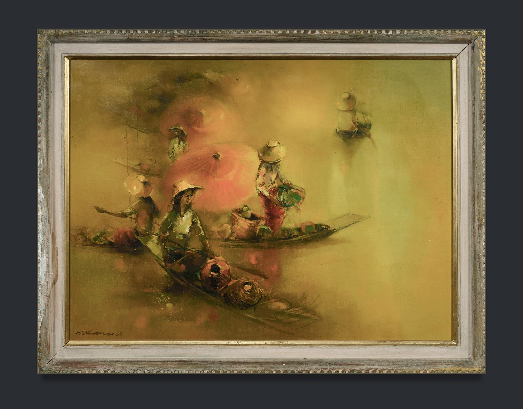 CHOO KENG KWANG (Singapore 1931-2019) Floating Market, 1968. Signed and dated lower left. Inscribed verso. Oil on Canvas 70x95cmEstimate $3,000-5,000