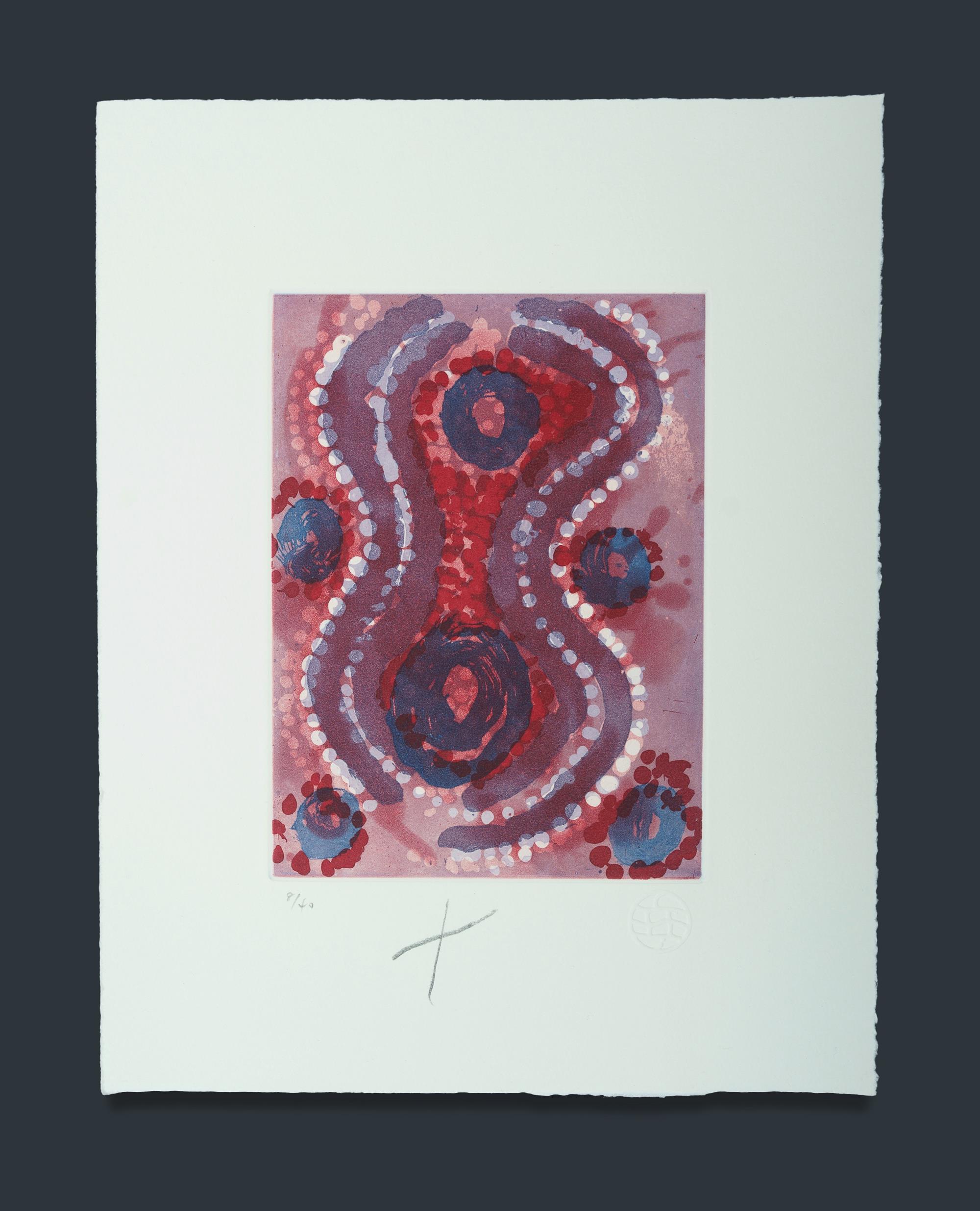 TJAPALTJARRI, Paddy Sims (Aboriginal c.1916-2010) (4) 'Fire Dreaming,' 2008. This portfolio contains 4 Paddy Sims etchings printed by Basil Hall. Each print is accompanied by a certificate of authenticity from Warlukurlangu Artists Aboriginal Association. An additional note from Basil Hall is also included. Presented in fold-out linen portfolio. Etchings (4) 8/40 32x25cm (sheet) 33x26x2cm (portfolio)